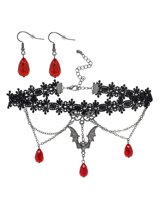 Komplet rdečega in črnega gotskega chokerja in uhanov