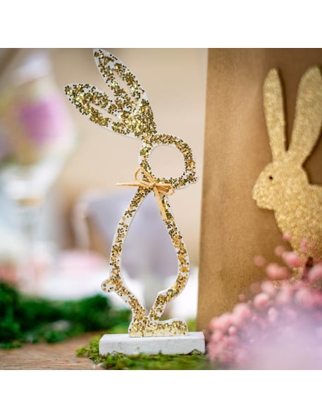 Lapin sur socle en bois blanc et paillettes dorées 18 cm pour Pâques