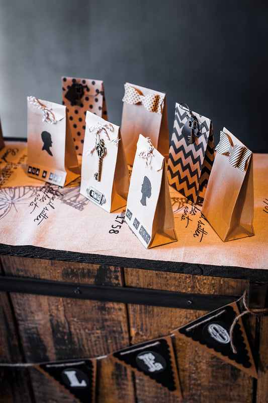 6 majhnih kraft vrečk 7,5 x 12,5 cm z oznakami in nizi