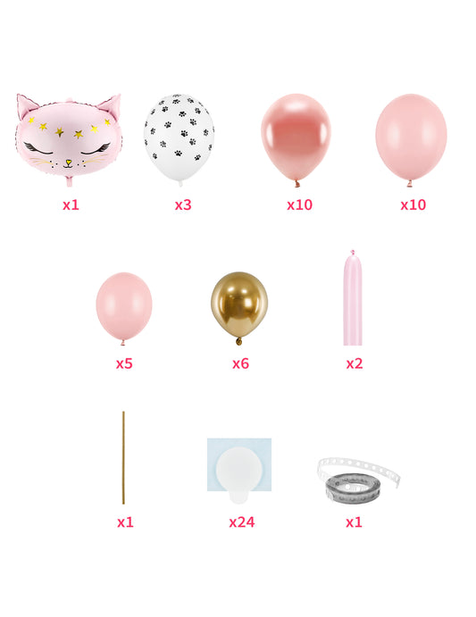 Vključeno : 34 balonov, 1 balon z mačjo tematiko , 2 modelirna balona , 1 slamica , 24 lepil , 1 trak za balone