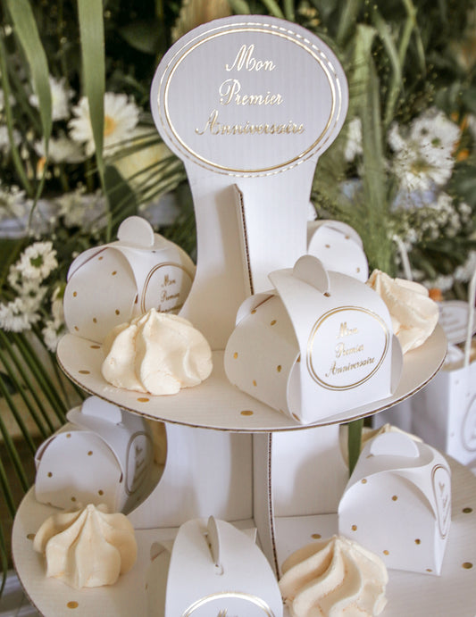 Razprodano8 kartonskih posodic za moj prvi rojstni dan, napolnjenih z zlatimi pikami.