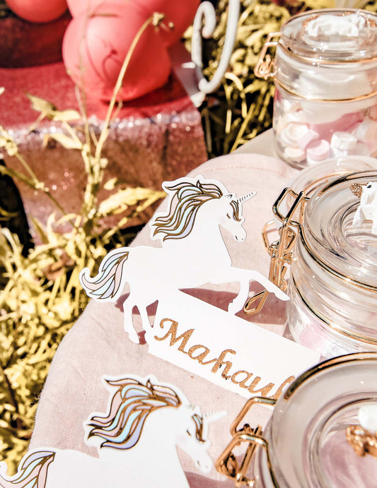 Razprodano8 pastelnih in zlatih voščilnic z motivom samoroga za rojstnodnevno mizo