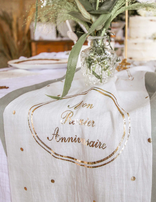RazprodanoPrtljažnik iz bombažne gaze, moj prvi rojstni dan, bel in zlat, 28 cm x 5 m