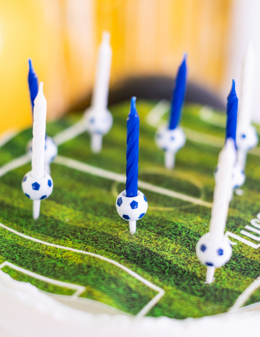 Razprodano12 rojstnodnevnih svečk z nogometno tematiko in držali za balone