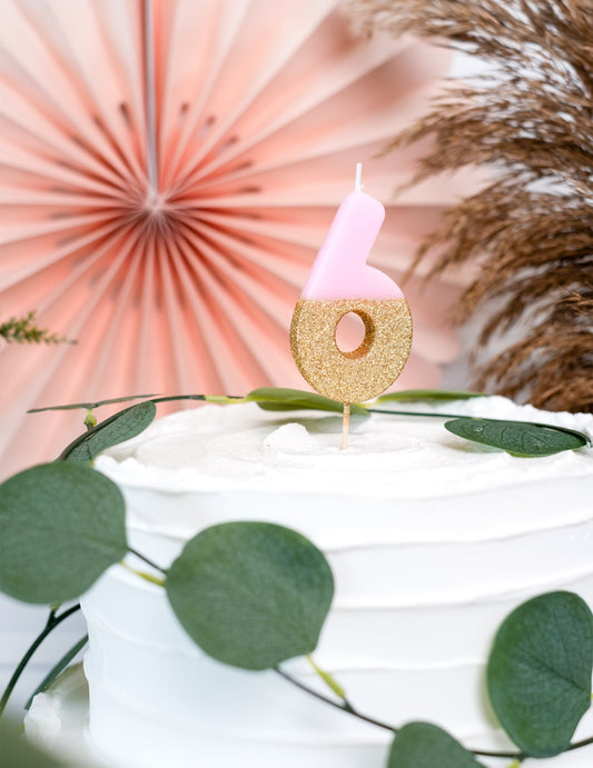 RazprodanoSvečka na palčki številka 6, roza in zlata z bleščicami, 13,8 cm za torto