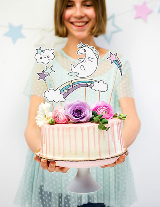5 okraskov za torto s samorogi in mavrico na palčkah 23,5 cm