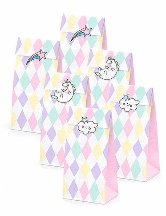 6 pastelnih papirnatih darilnih vrečk s samorogi, 8 x 18 x 6 cm