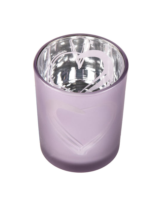 RazprodanoStekleni svečnik v obliki srca v parme vijolični barvi 6,8 x 5,8 cm mat srebrna