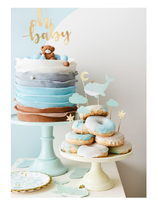 7 okraskov za torto v obliki nebeško modrega kita, 11 x 14 cm zlati oblak