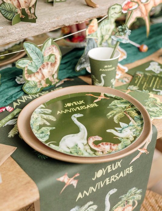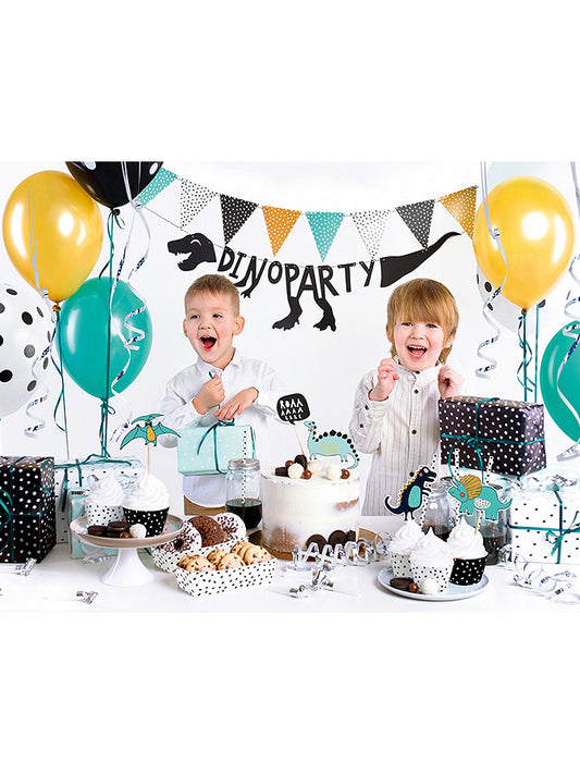 Vključeno : 5 lesenih trzalic z dinozavri, 10 slamic , 6 Brez zadrege , 1 trak , 1 Serpentin , 2 pravokotni posodi , 6 modelčkov za kolačke , 1 venec z zastavico , 1 dinozavrska girlanda za zabavo , 6 balonov