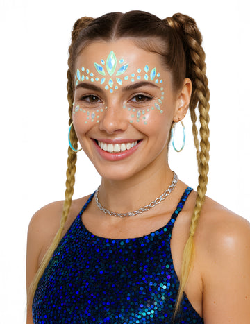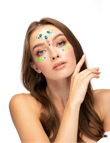 Vključeno : 1 šablona , 14 okrasnih kamnov , 1 svinčnik za ličenje , 1 paleta senčil za oči , 1 vrečka bleščečega gela , 1 gobica