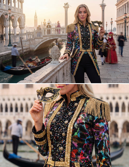 Ženski kostum za ženske v veliki velikosti z zlatimi vzorci