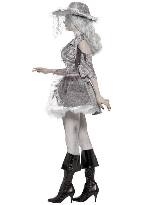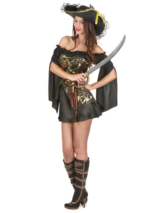 Vaš piratski kostum je pripravljen, ne ustavite se tam! Dopolnite svojo obleko za zabavo, da svojemu liku prinesete verodostojnost. Piratski nakit kot so ogrlica in uhani v obliki zlatega kovanca, pa tudi hlačne nogavice z vzorcem lobanje in končno lep par piratskih škornjev za ženske.