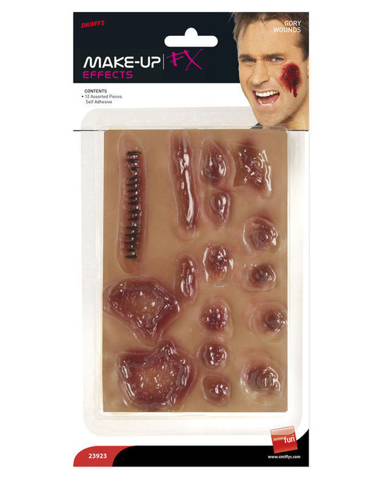 Vključeno: 2 penasti gobice, 1 krtača, 1 zadrga, 1 vrečka lažne krvi (7 ml), 1 vrečka tekočega lateksa (7 ml), 1 vrečka zelene zelene zelene (7 ml), 2 črno -bela senčila (1,5 g vsak)