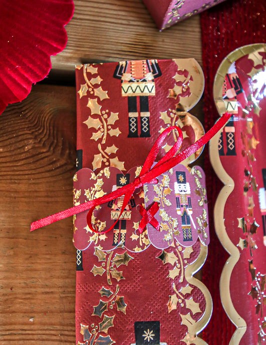 Razprodano8 obročkov za prtičke z motivom Hrestača in rdečim satenastim trakom