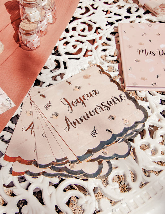 20 serviettes papier joyeux anniversaire rose gold à motifs étoiles roses
