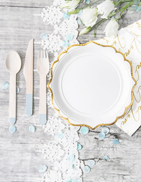 6 petites assiettes en carton blanches et bordures dorées ciselées 18 cm