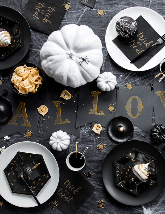 Razprodano6 črno-zlatih kartonskih krožnikov v obliki netopirjev 20 cm šesterokotno