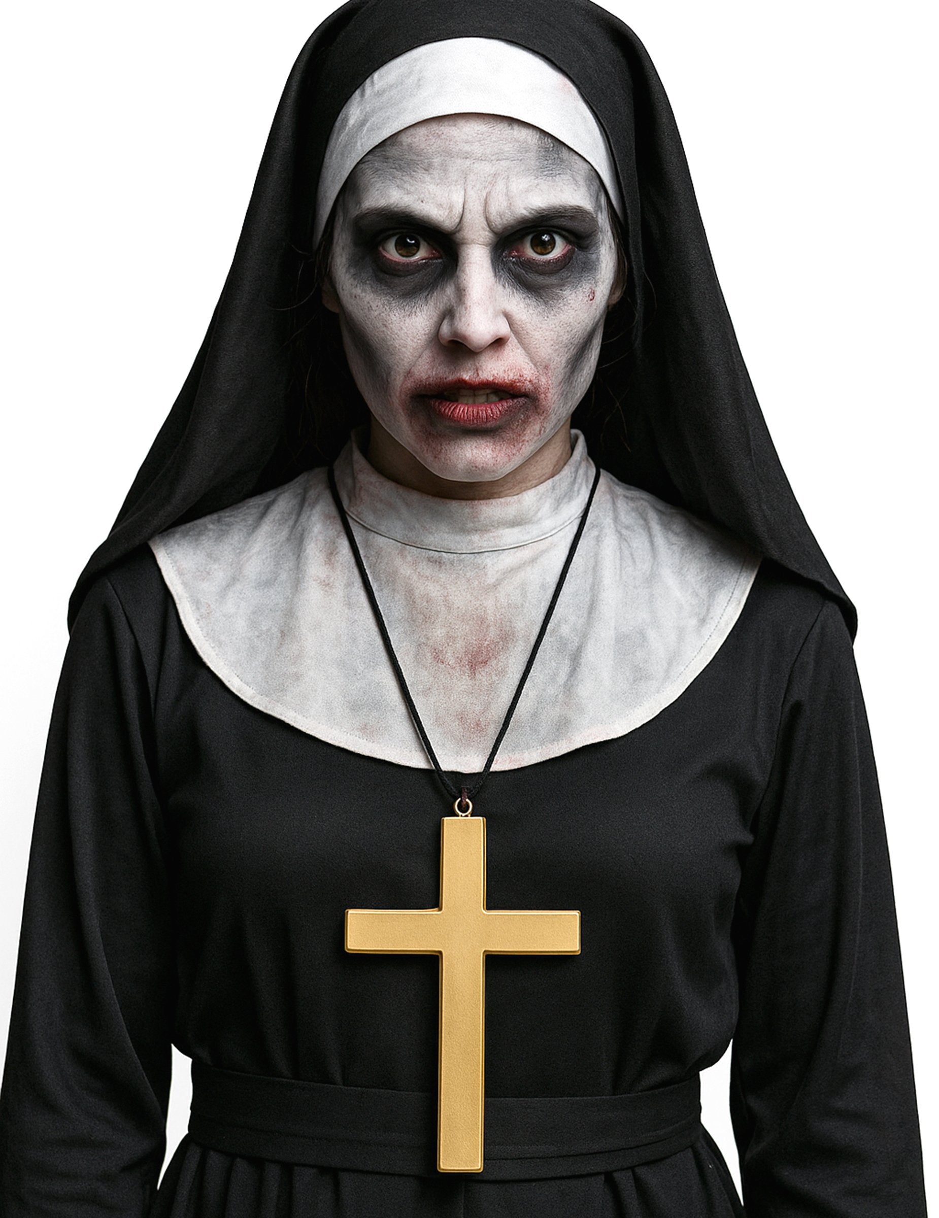 Ta zlati barvni menih križ je plastika. Visok je 23 cm in širok 13 cm. Križ je lègere, tako da ga lahko dolgo nosite brez najmanjšega zla. Idealna dodatna oprema za dokončanje kostuma duhovnika, nobenega za karneval ali za tematski večer.