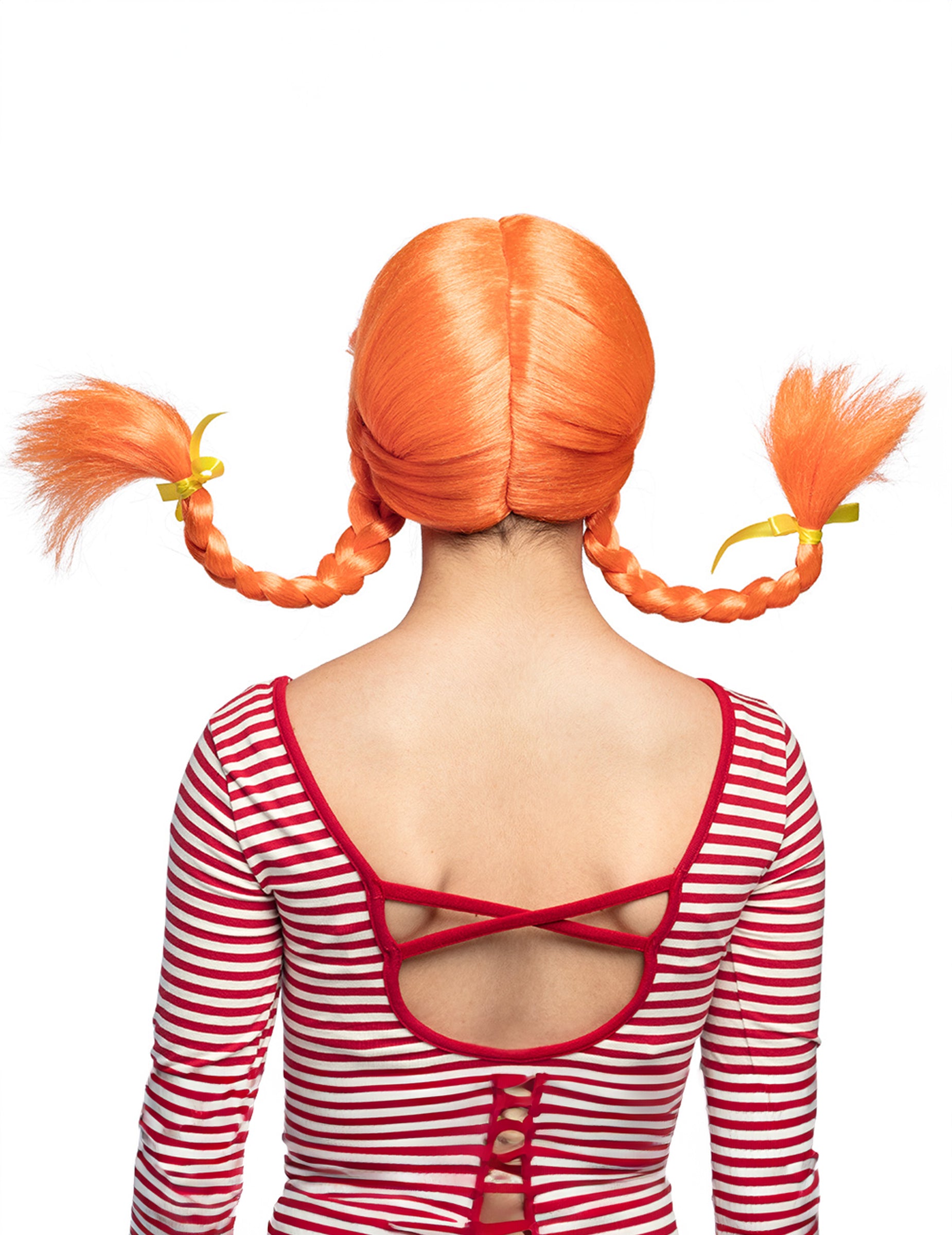 Ta ženska lasulja je oranžna. Pletenice se dvigajo na straneh in obrobje je dokončano. Elegantno bo dopolnjeval vaše zlonamerne kostume med prikrito ali tematsko zvečer.