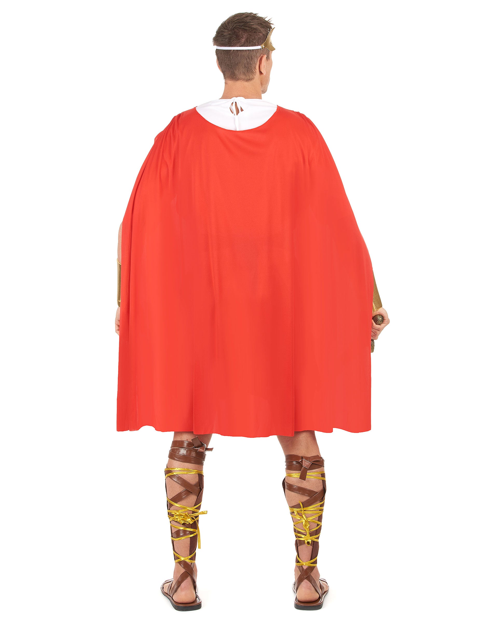 Ta rimski kostum za moške je sestavljen iz 7 elementov. (meč in sandali niso vključeni) Bela tunika z rdečim ogrinjalom in zlatimi trakovi. Spredaj je prišit lažni oprsnik iz rjavega blaga. Centurion krilo za zavezovanje zadaj. 2 zlati zapestnici iz mehke pene za pritrditev okoli podlahti. Elastična krona, ki spominja na zlate in sijoče lovorike. In 2 grelnika za noge iz rjave klobučevine, ki ju bosta držala na mestu z dvema zlatima trakoma, ki se ju bosta prepletala. Ta rimski kostum bo nedvomno najbolj zgodovinski med vašimi kostumskimi zabavami! Na vas je, da predelate zgodovino!