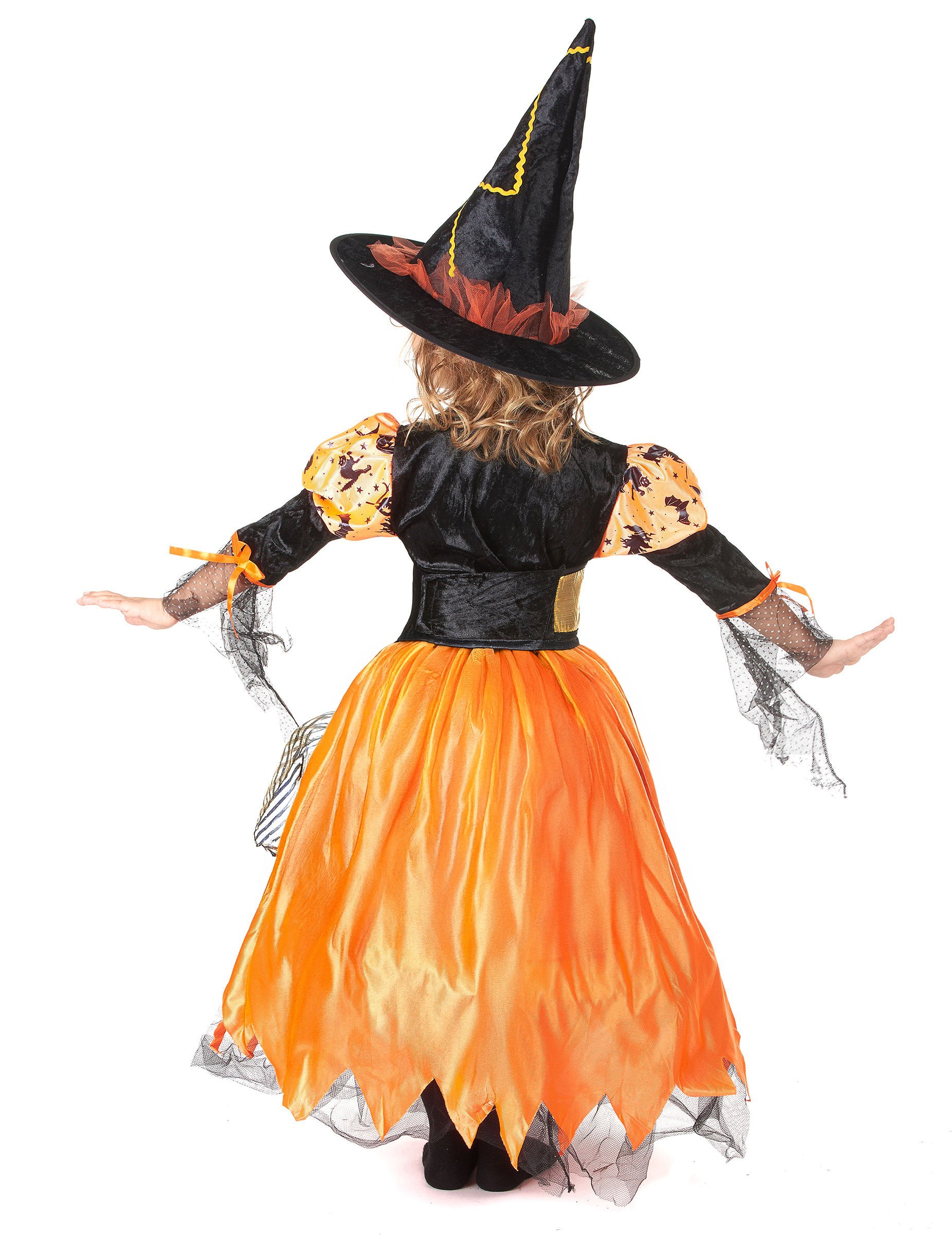 Ta čarovniška kostum za noč čarovnic je za dekle in vključuje obleko, pas in klobuk. Obleka ima zelo precej črne vzorce čarovnic na oranžnem ozadju. Imitacija tila in žameta se izmenično ustvarjata zelo kvalitativni učinek. Plastični obroč, ki je prisoten pod obleko, bo dal volumen celotnemu. Pas, ki se praska, bo upognjena velikost. Zlata je zlata z lažnim vezanjem spredaj. Klobuk, ki ustreza preostali preobleki, bo v celoto prinesla le razred. Ta kakovostni kostum bo kot nalašč za to, da bo vaša hči najlepše čarovnice, da bo na noč čarovnic dobil bombone!