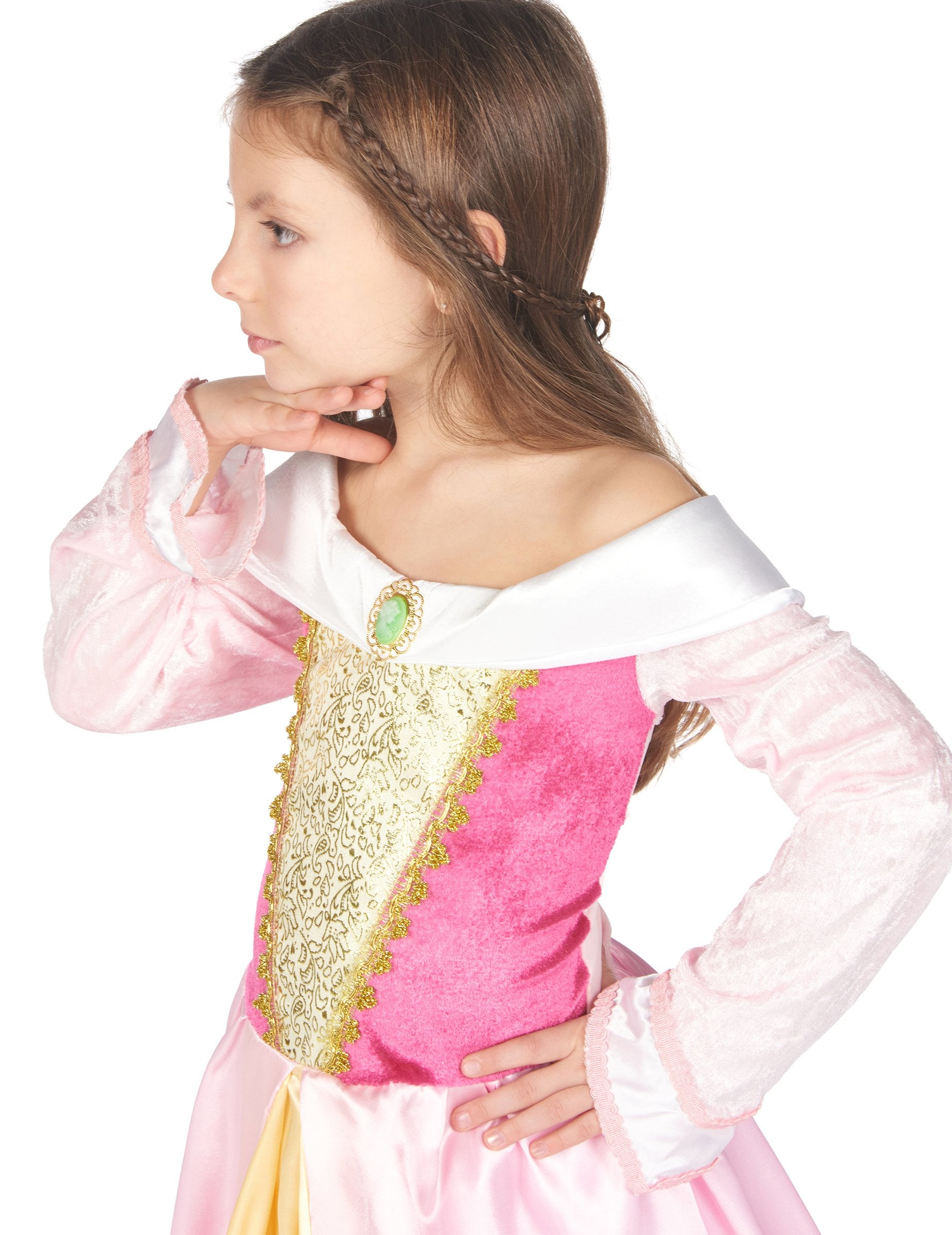 Ta princesov kostum za dekle je sestavljen iz roza satenaste obleke s čolnom, precej zlato vezenje na doprsju in medaljona na prsih. Čipka krasi konec rokavov in velikost je obokana, da daje volumen krilu. Ta kostum princese vključuje tudi spodnji del za ohranjanje volumna celote (čevlji niso vključeni). Ta kostum bo idealen za karneval, šov ali kateri koli drug prikrit dogodek.