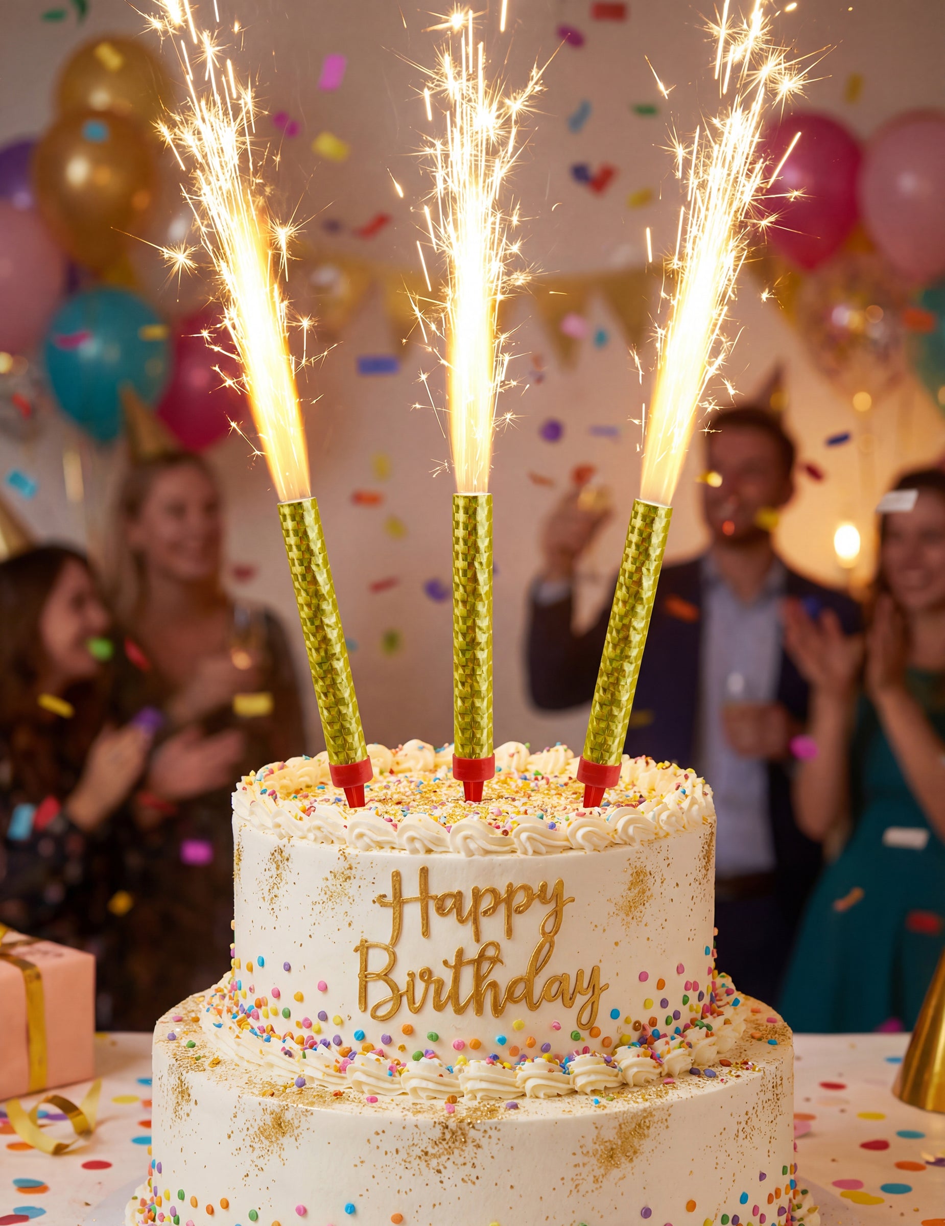 Veliko treh majhnih vodnjakov za notranje umetnosti. So zlate barve in se dostavijo naključno. Vodnjaki so visoki 9,5 cm in delujejo z vklopom na koncu. Ta serija 3 fontane je pravi "sanjski šopek". Za trenutek bodo osvetlili vašo torto na najlepši način med rojstnim dnevom.