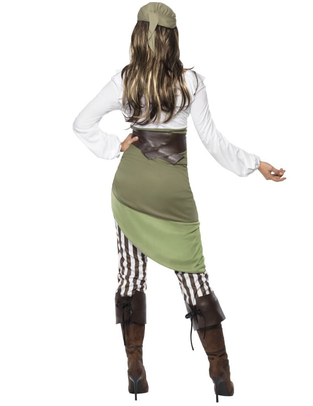 To seksi gusarsko preobleko za ženske sestavlja bluza, krilo, gamaše, bandana in par škornjev (predpomnilnik, sablja in škornji niso vključeni). Bluza z dolgimi žarami je bež s čudovitim letečim vratom. Krilo je bež/rjavo s svetlo zelenim volanom na dnu. Zlomljeni beli in rjavi črti dopolnjujejo ta komplet. Končno je vključena zelena bandana, ki ustreza krilu. Privezati je treba okoli glave. Čevlji, ki jih je treba povezati, zahvaljujoč vezalcem za valjani učinek in rjavi pas, prihajajo do dodatka tega gusarskega kostuma. Ta piratski kostum je idealen za to, da vas izpostavi med večerom, prikrito na temo piratstva. Lahko vas bo projiciral v vesolje piratov, združil ženskost in eleganco s tem svetom, polno nevarnosti.