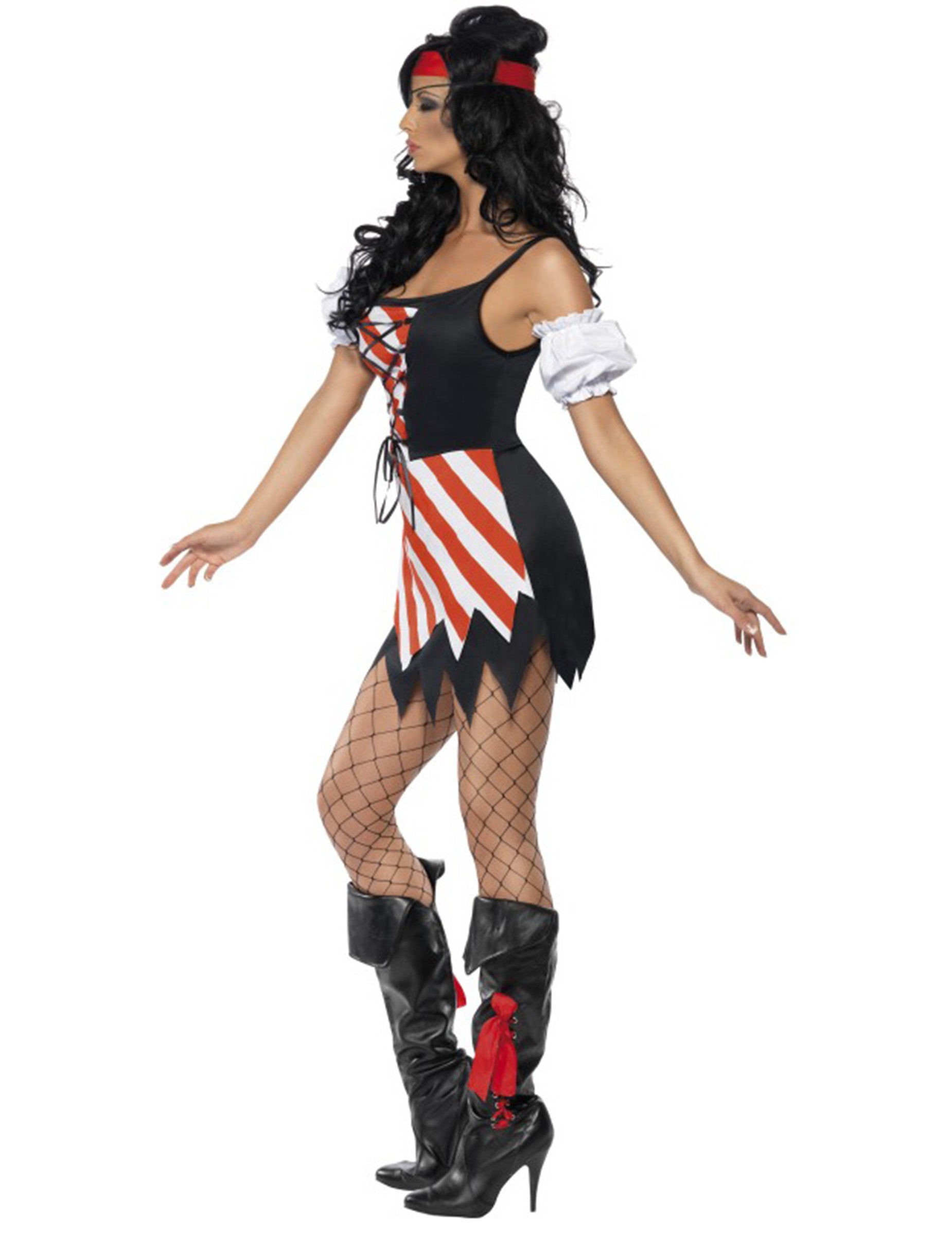 To žensko piratsko preobleko je sestavljeno iz kratke nastavljive obleke bustier Effect, zahvaljujoč čipkam in dveh elastičnih manšetah (čevlji, hlačne nogavice in pištola niso vključeni). Rdeča pasica je nameščena in nastavljiva po vaši udobje, očesni pokrov pa se nosi zaradi elastike. Dva bela rokava dopolnjujeta to obleko. Idealen je za vaše prikrite ali tematske večere. Ta obleka velike velikosti. Menimo, da boste vzeli velikost spodaj.