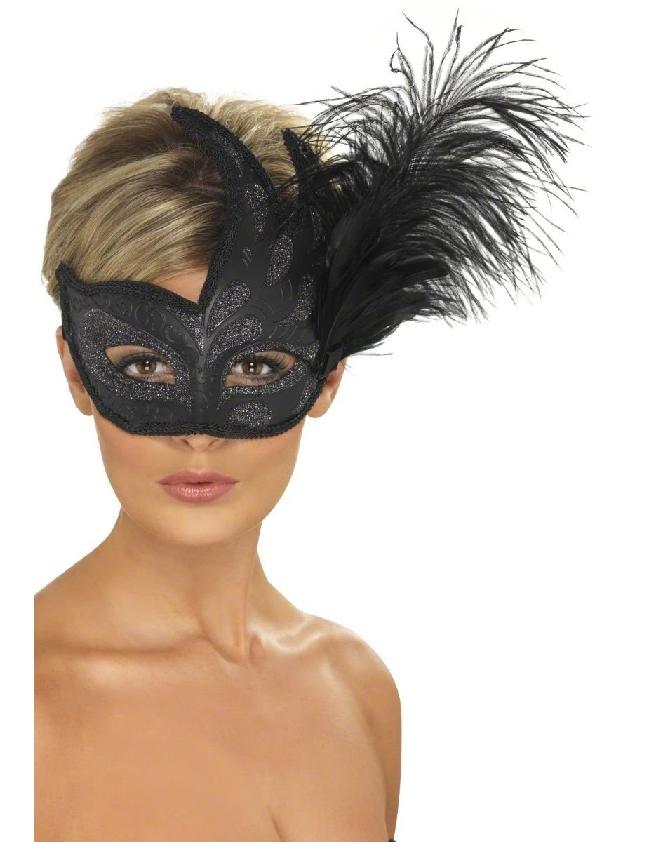 Ta črni volk s srebrnimi bleščicami in perjem je razkošen. Okodi ga, okoli roba, z vezeno mejo in njegova oblika je zelo izvirna. Dva črne trakove omogočata, da se pritrdita na glavo in dve nalepki Felt sta nameščeni v templjih, da bi zagotovili udobje in zaščito. Ta dodatek bo idealen, če želite kombinirati eleganco in skrivnost med zamaskirano kroglico ali prikrito večerjo.
