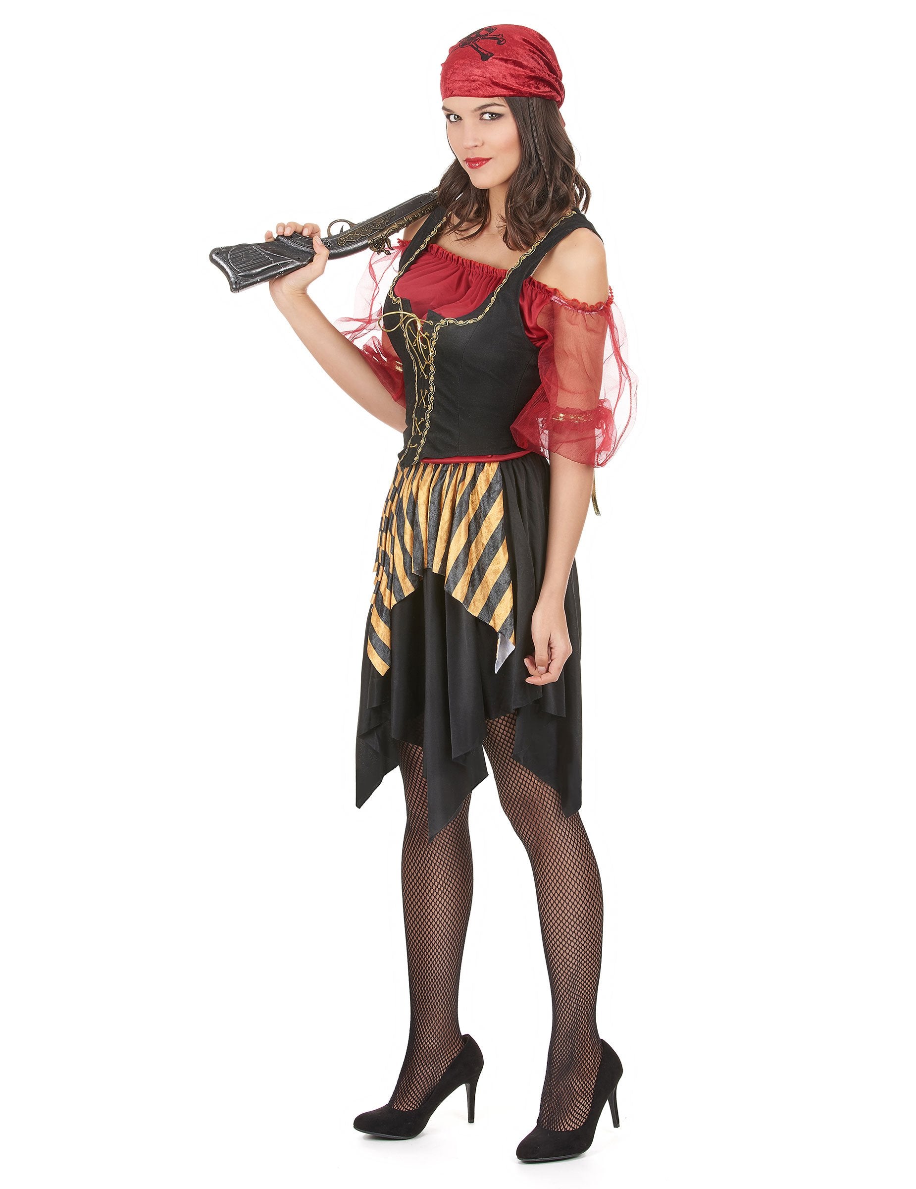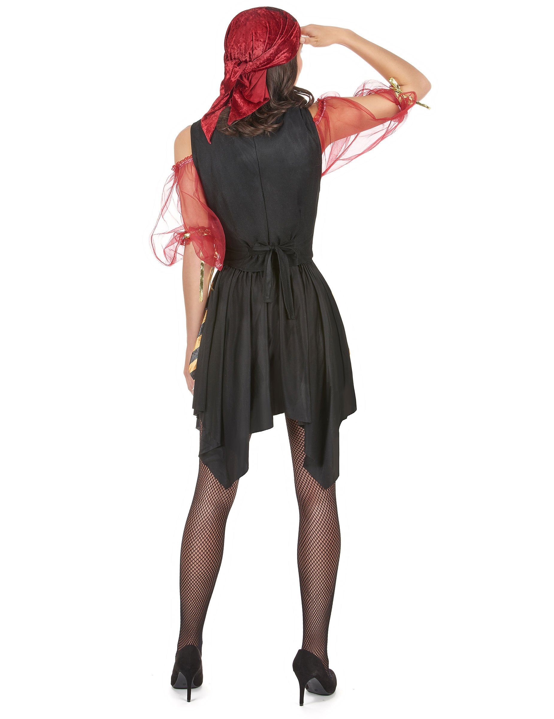 To gusarsko preobleko za ženske je sestavljen iz vrha, jopiča, krila in bandane (čevlji, nogavice in dodatki niso vključeni). Rdeči top ima rokave tila in na koncih se šivajo zlati trakovi. Črno in rumeno krilo je zelo elastično, popolnoma se bo prilagodil vaši morfologiji. Črni televi strani z zlatim bodicem bo okrasila to obleko. Rdeča bandana z lobanjo, natisnjeno na vrhu, bo odlično dodala panoj. Ta preobleka bo idealna za to, da boste med temi zvečer postali najbolj fantastični gusarji.