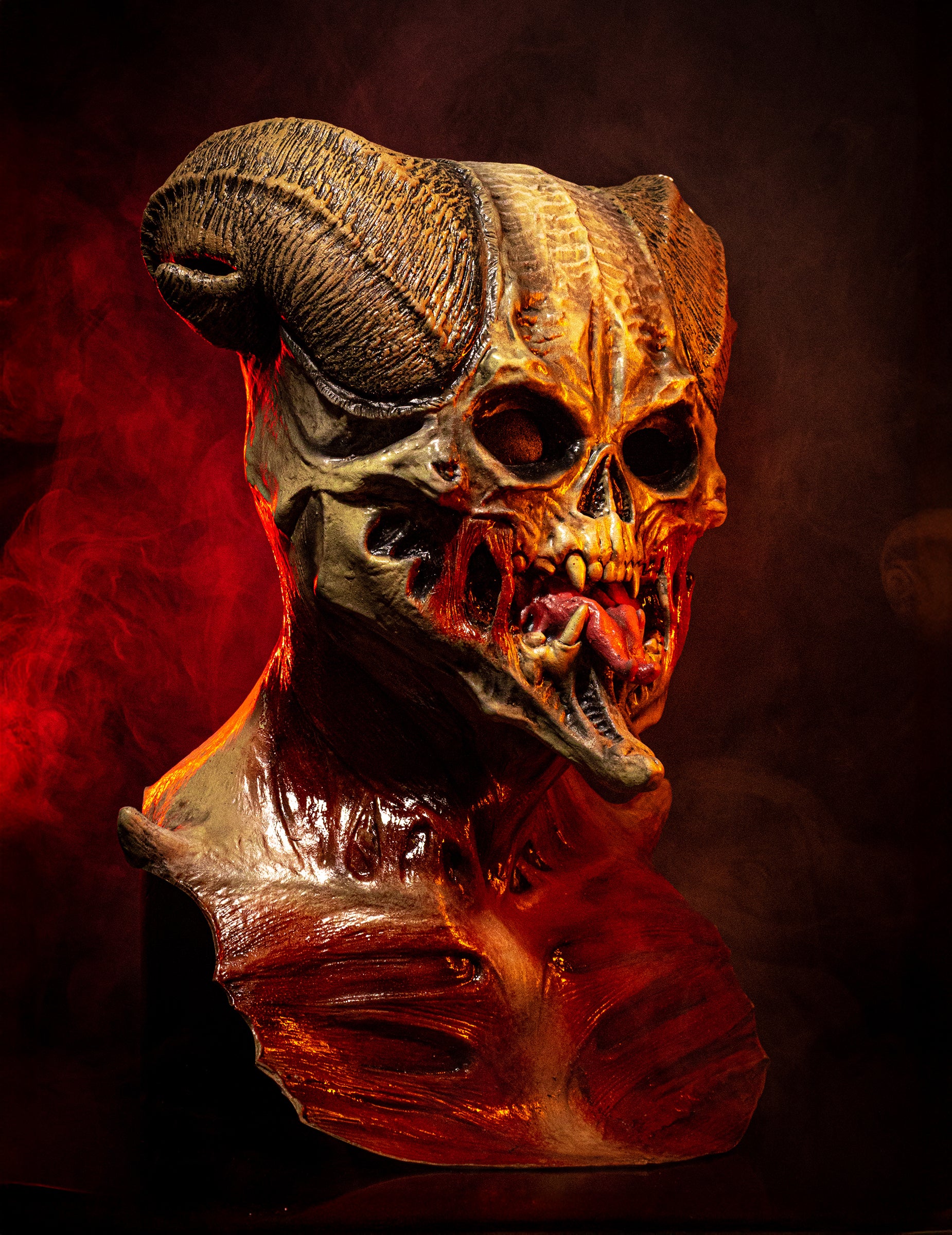 Ta polna maska ​​iz lateksa predstavlja lobanjo hudiča s krvavim okostjem na prsni koš. Ta ročno poslikana dodatna oprema je idealna za dokončanje preobleke med večerjo za noč čarovnic.