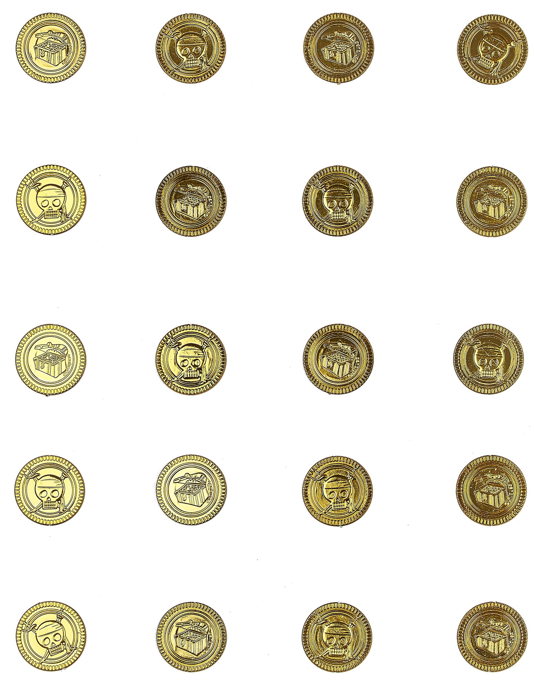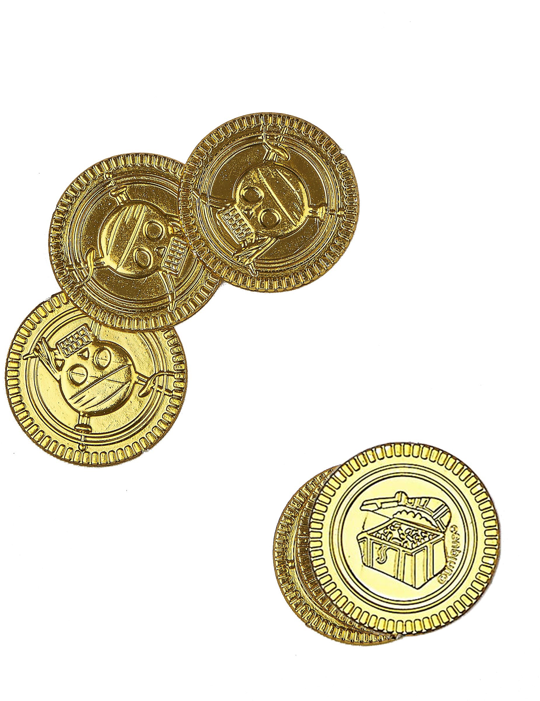 Ta serija je sestavljena iz 30 plastičnih zlatih kosov, od katerih je vsak udaril lobanja ali prtljažnik. Deli so premera približno 3 cm. Za uspešen dogodek na temo gusarjev lahko napolnite skrinjo za zaklad teh zlatih kron!