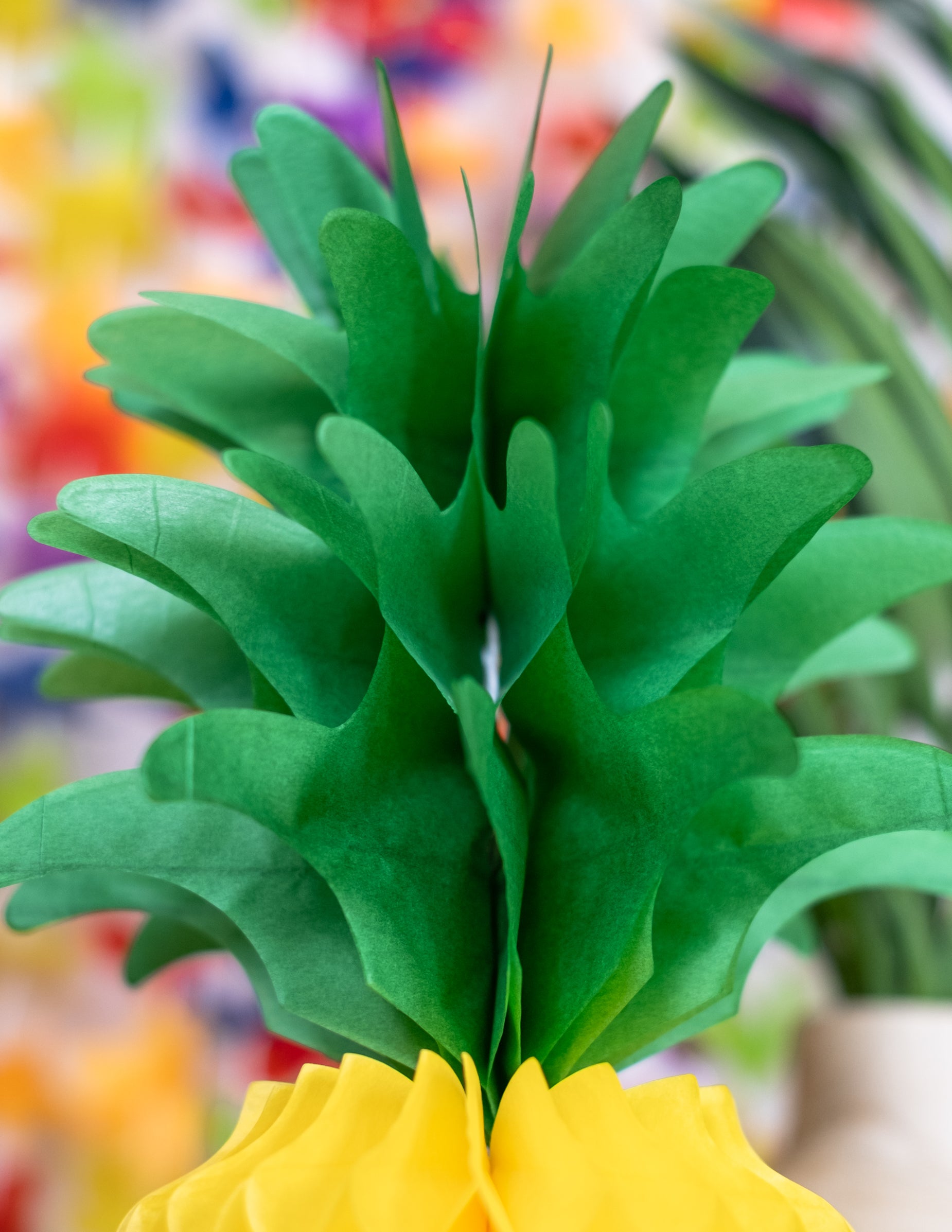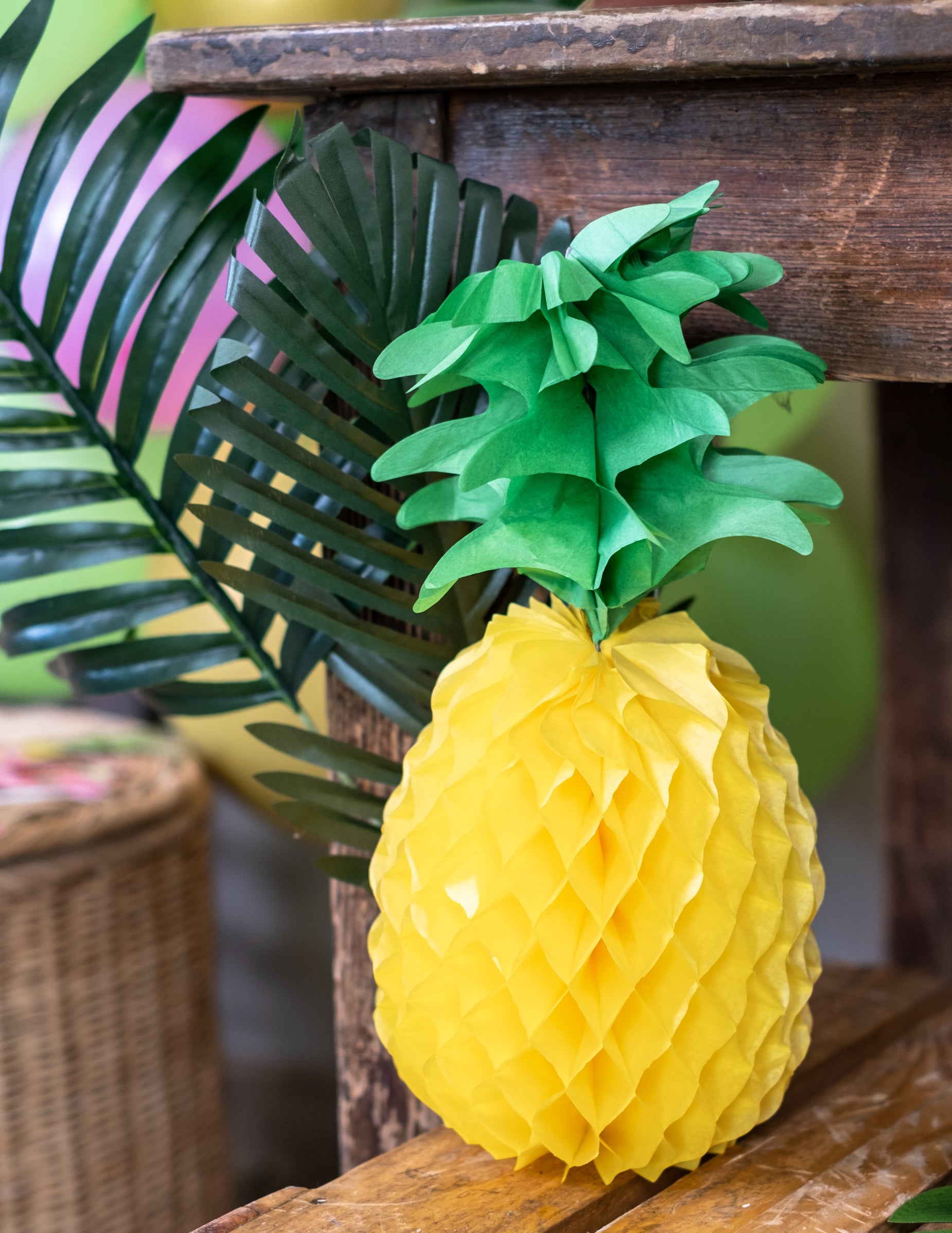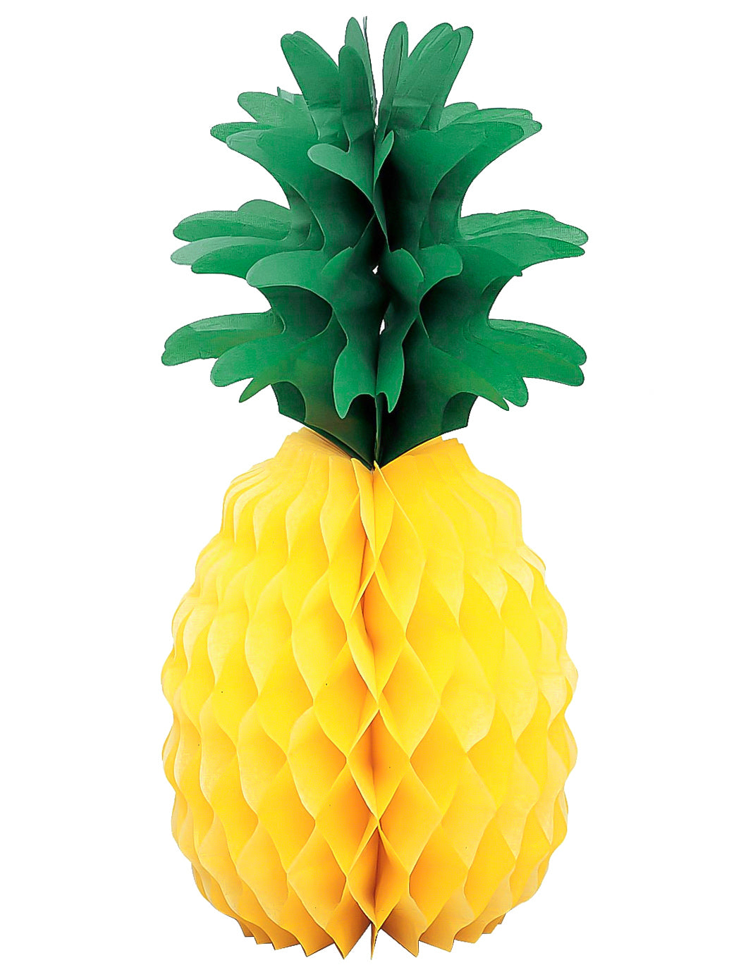 Ta namizni center za ananas je izdelan iz papirja satja. Rumena in zelena barva, visoka je približno 35 cm. Ta miza za ananas bo kot nalašč za dokončanje dekoracije za mizo na Havajih.