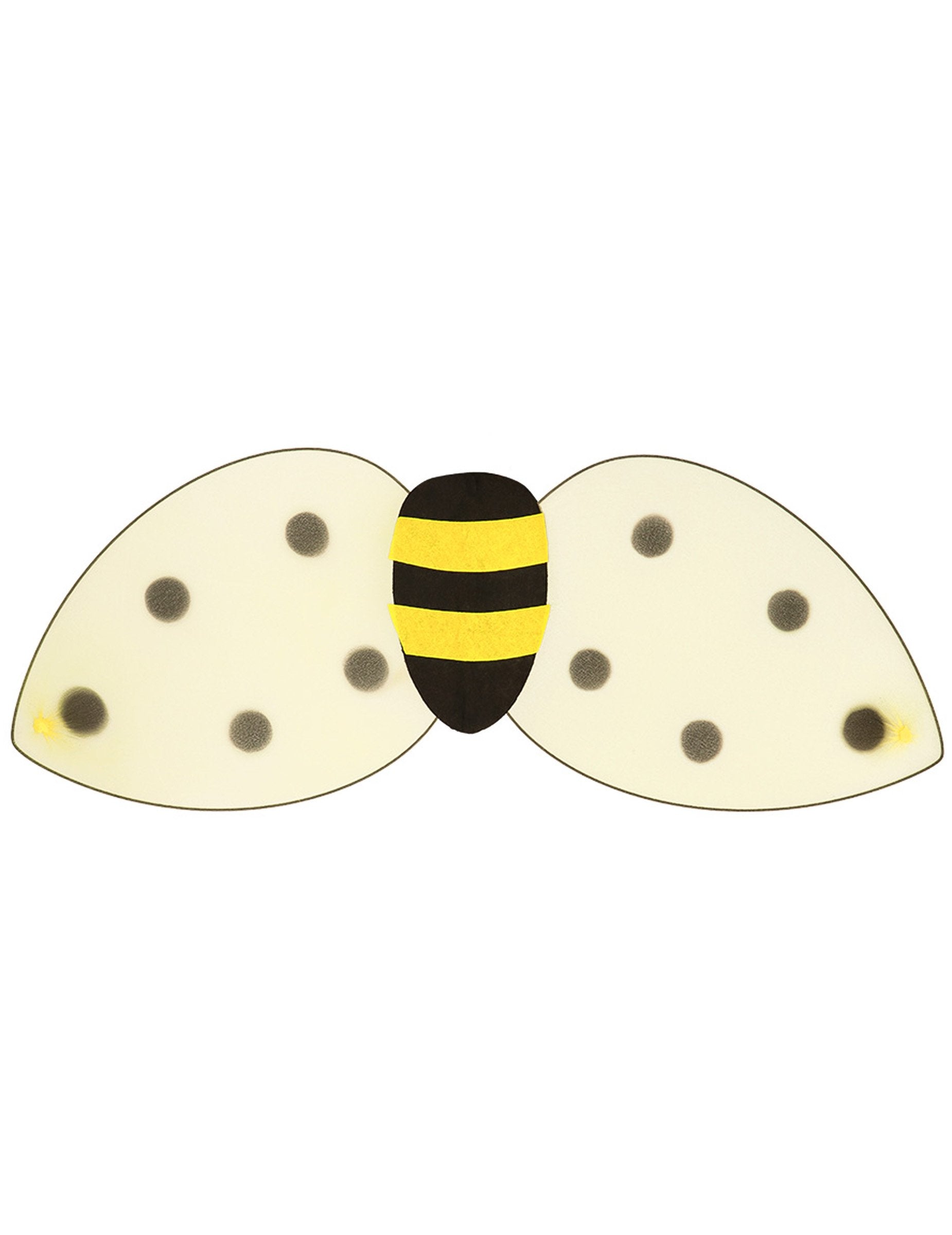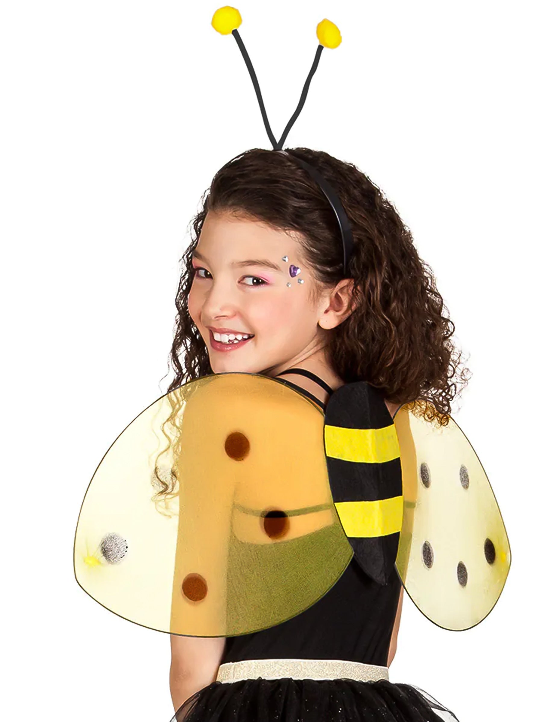 Ta komplet za odrasle čebele je sestavljen iz črnega traku za glavo s prožnimi antenami in majhnimi rumenimi pompomi, pa tudi par rumenih črno -grahovih kril, ki merijo približno 64 x 23 cm. Elastika vam bo omogočila, da krila držite za hrbtom. Ta komplet je idealen za dokončanje vašega kostuma med prikrito ali tematskim večerom.