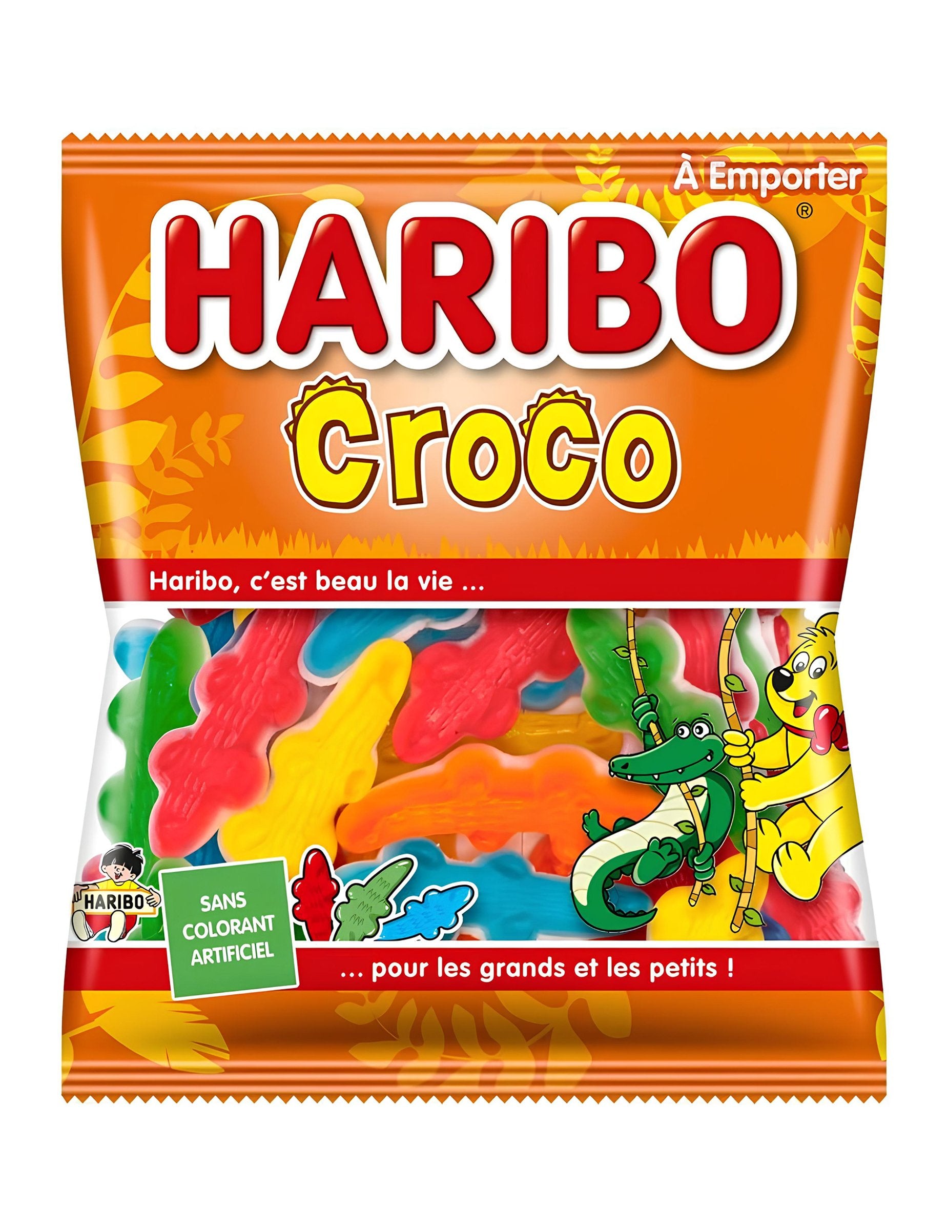 120 g vreča izvoljenih bombonov v obliki krokodilih različnih parfumov in različnih barv. Sestavine: glukozni sirup; sladkor; dekstroza; želatina; Zakisljična: citronska kislina; Koncentrati za sadje in rastline: Carthame, Spirulina, jabolko; Obrnjen sladkorni sirup; aroma; Barve: Carmine, lutein; Previšanja: beli in rumen čebelji vosek, Carnauba vosek. Držite se toplote in vlažnosti.