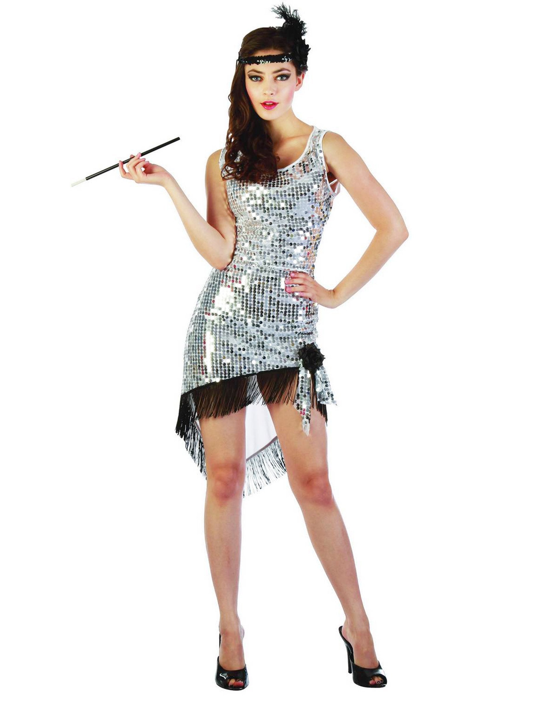 Ta kostum Charleston za ženske je sestavljena iz srebrne obleke in trakove za glavo. Srebrna obleka z bleščicami na sprednji strani in Združena bela v zadnjem delu ima obrobje na dnu in črno roza. Tkanina, ki je lahka, vam svetujemo, da nosite kratke ali neprozorne nogavice. Podrobnosti, ki razlikuje v tem kostumu 20 -ih let: elastičen Charleston Band s črnimi bleščicami je dopolnjen s pero. Ta komplet vam bo omogočil podoživel ropotajoče dvajsetih med prikrito ali tematskim večerom.