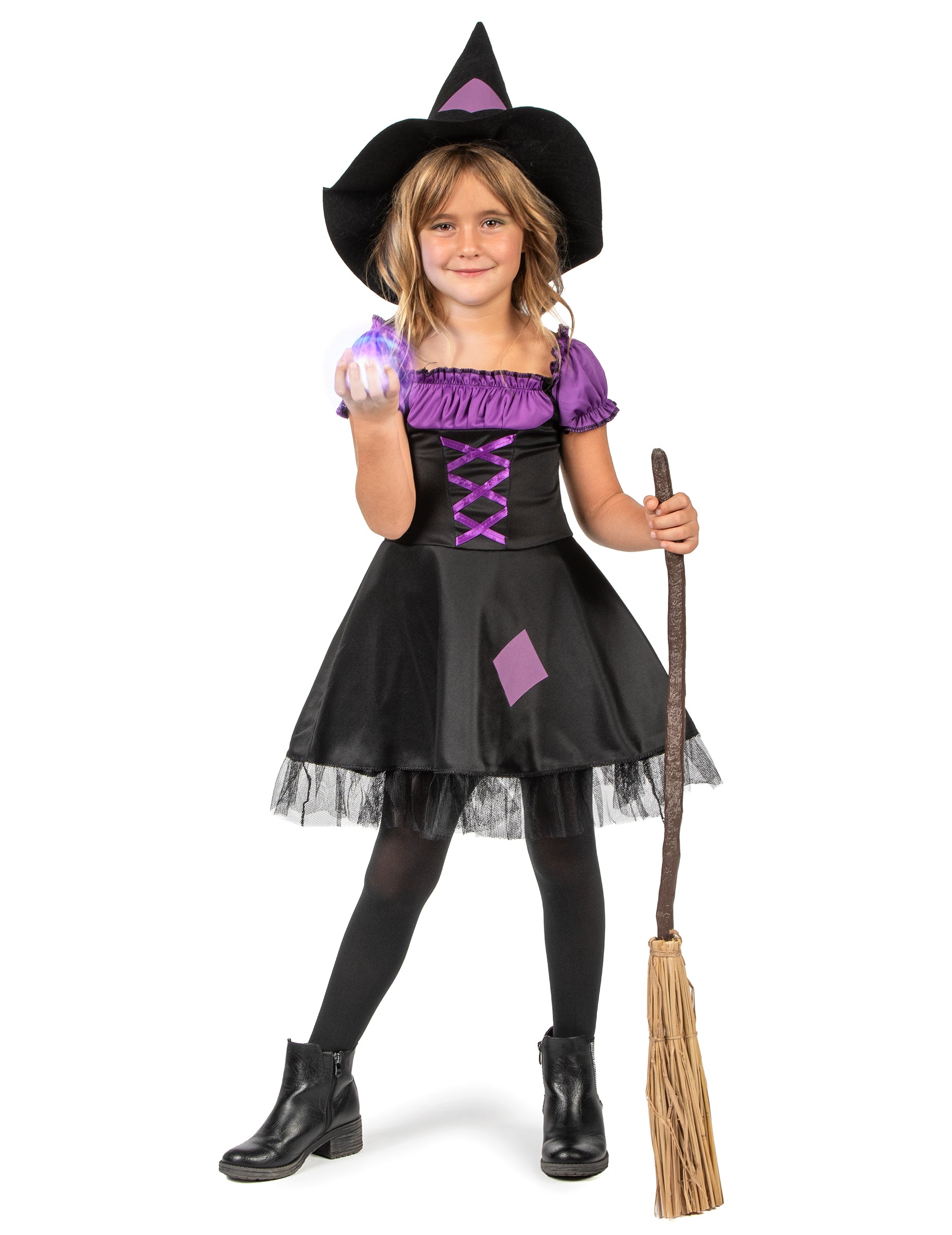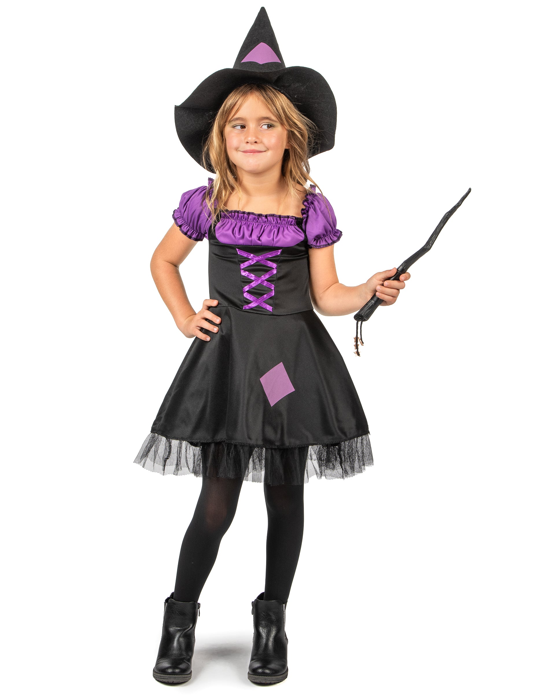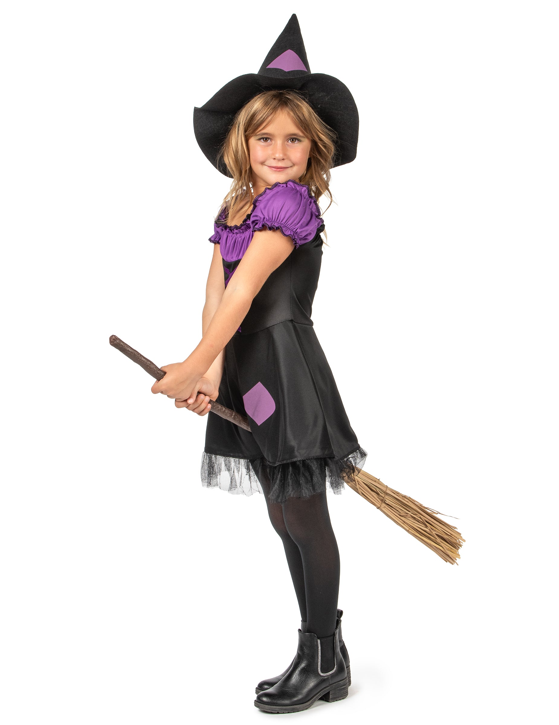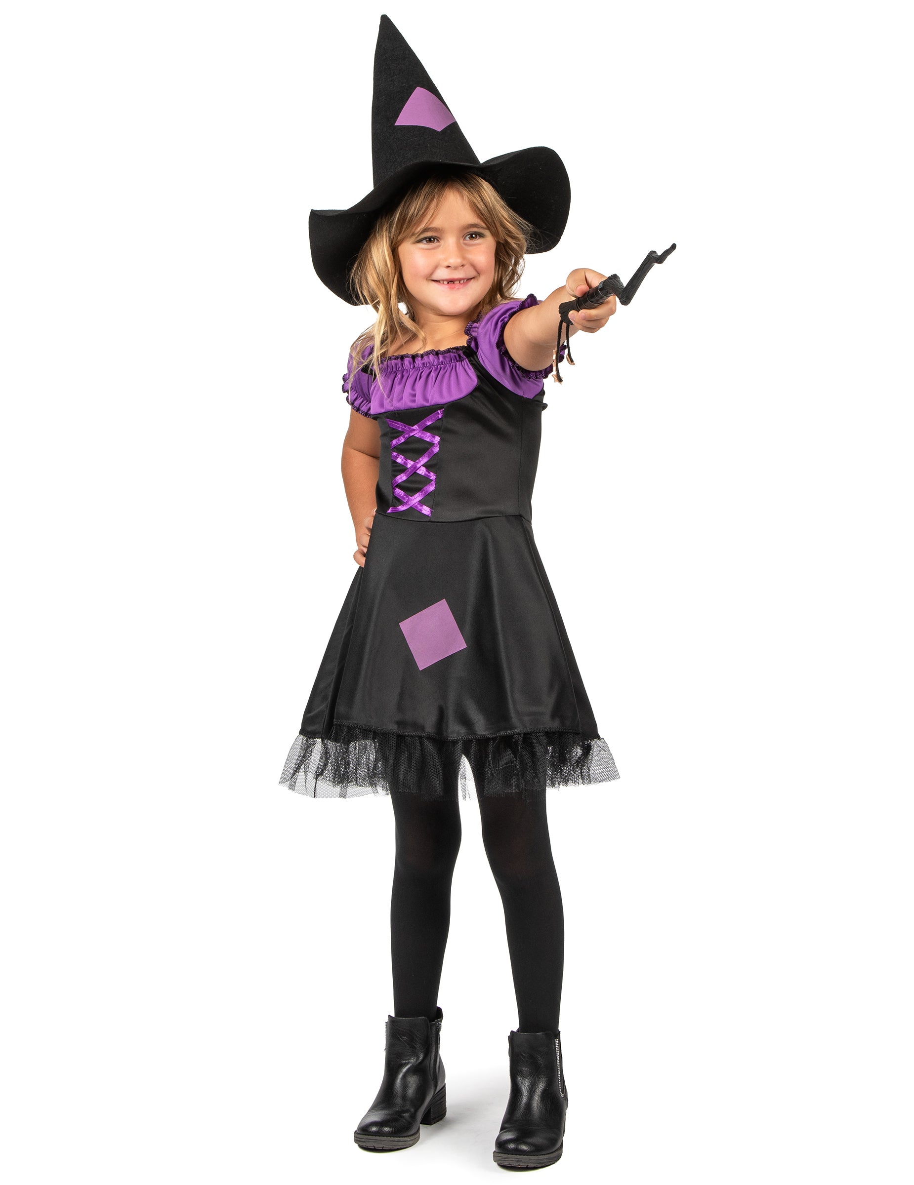 Ta čarovniška kostum za dekle je sestavljena iz obleke z integrirano majico in klobukom. Črna barvna obleka bo dala vtis, da pod njim nosite vijoličen vrh. Na sprednji strani je prisotno lažno vezanje vijolične barve s satenastim učinkom. Dno krila je okrašeno s črnim tilam in bo dal celoten glasnost. Elastična, ta obleka bo zelo enostavno oblečena brez zaprtja. Končno bo prišel ustrezen klobuk, ki bo dodal vaš kostum. Ta preobleka bo kot nalašč za utelešenje prave čarovnice na noč čarovnic!