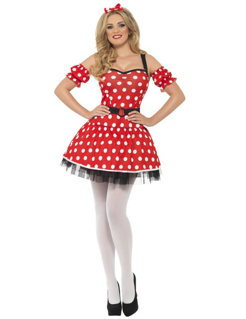 Ta kostum miške je sestavljen iz obleke, dveh manšete in trakov za glavo (hlačne nogavice in čevlji niso vključeni). Obleka je rdeča z belimi pikami. Njeni trakovi so črni. Manšete, elastične, se ujemajo z obleko. Zaključek za glavo z rdečim vozlom z belimi polkami konča celoto. Tako kostumirani, boste med naslednjim tematskim večerom najbolj elegantna miška.
