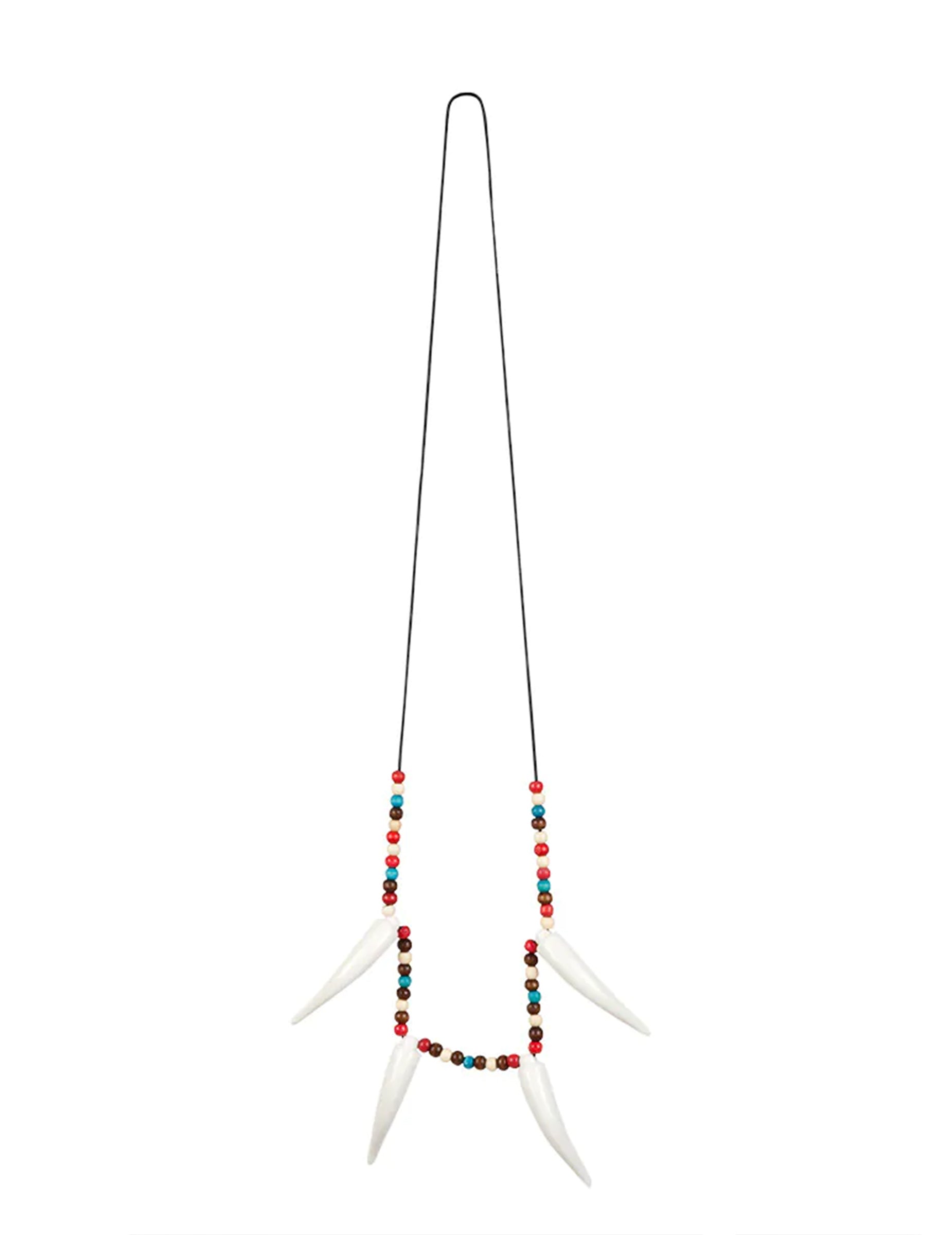 Ta zelo lepa ogrlica v indijskem slogu meri 72 cm. Sestavljen je iz črne povezave z majhnimi rdečimi, zelenimi in lesenimi barvnimi kroglicami ter 4 ponarejenimi velikimi zobmi. Ta dodatek bo kot nalašč za dokončanje vaše obleke med indijskim večerom.