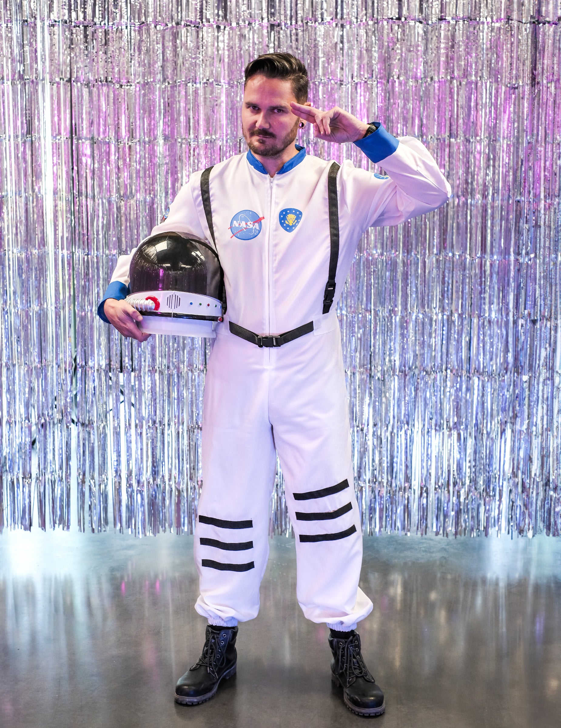 Ta kostum za kozmonavt za moške je sestavljena iz kombinacije (čevlji in čelade niso vključeni). Ta kombinacija je bela z ovratnikom in modrimi zapestji. Nasine logotipe so prisotne na ravni doprsnega oprsja. Črni trakovi so pritrjeni tudi na sprednji strani kombinacije. Ta kombinacija se spredaj zapre z zadrgo. Ta kostum bo kot nalašč za osvajanje prostora med večerom, preoblečenim s prijatelji ali za karneval.