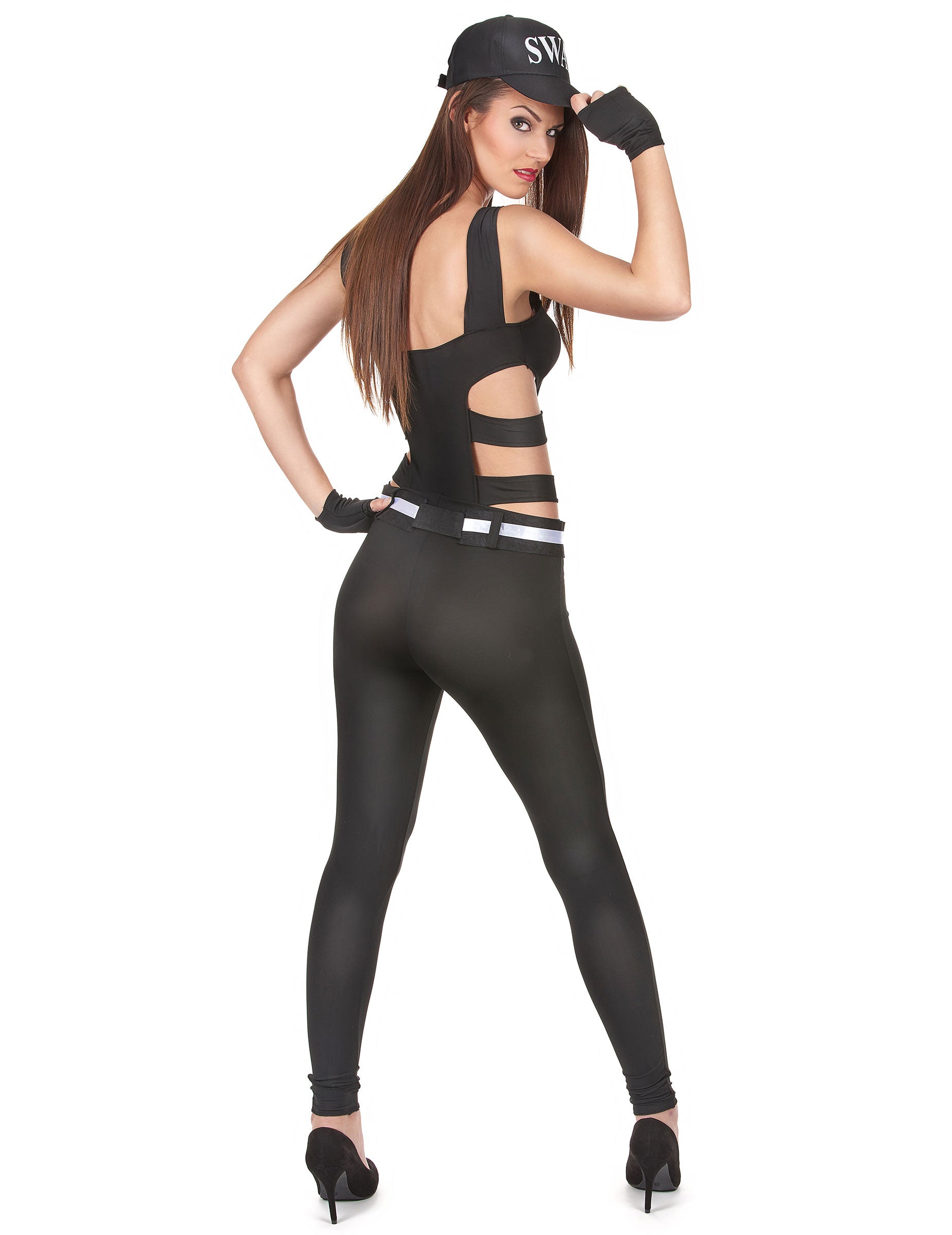 Ta swat za žensko preobleko je sestavljen iz kombinacije, pokrovčka, pasu in rokavic (čevlji niso vključeni). Tesna kombinacija je črna z odprtinami na vrhu, na ravni reber. Opremljena je z velikostjo, da lahko postavi pas. Ta kombinacija se spredaj zapre z dolgim ​​zadrgo. Črna kapa je natisnjena iz napisa "SWAT" v beli barvi. Na zadnji strani glave se zapre s praskom. Črni in srebrni pas se zapre s črno plastično zanko. 2 palčnika sta črn. Ta kostum bo idealen za pridružitev seksi elitni četi med preoblečenim večerom.