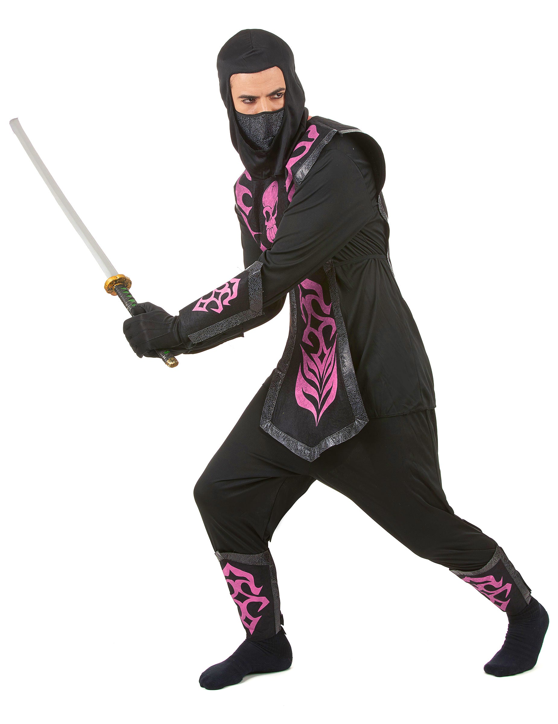Ta ninja preobleka za moške je sestavljena iz kapuce, maske, visokega, oklepa, hlač, zaščitnikov orožja in zaščitnikov golenice. Vrh in hlače so črne. Vrh je privezan na zadnji strani z dvema črnima povezavama. Hlače so elastične na pasu. Plastron predstavlja oklep nindže. Črna barva, v tkanini iz filca, je natisnjena z roza vzorci spredaj. Ta lažni oklep vam bo pokril doprsni kip spredaj in zadaj. Naredi se kot majica in je opremljen z elastičnimi trakovi na straneh. Kapuca, črna, ima široko odprtino za obraz. Dopolnjuje ga siva in črno siva in črna predpomnilna maska. Ta maska bo vzdrževana v ušesih z uporabo elastike. Manšete in gamaše bodo le skrile sprednjo stran rok in teleta. Z oklepom se držijo okoli vaših rok in Jambres zahvaljujoč elastiki. Ta komplet bo kot nalašč za preoblikovanje v japonskega bojevnika med karnevalom ali za prikrit večer.