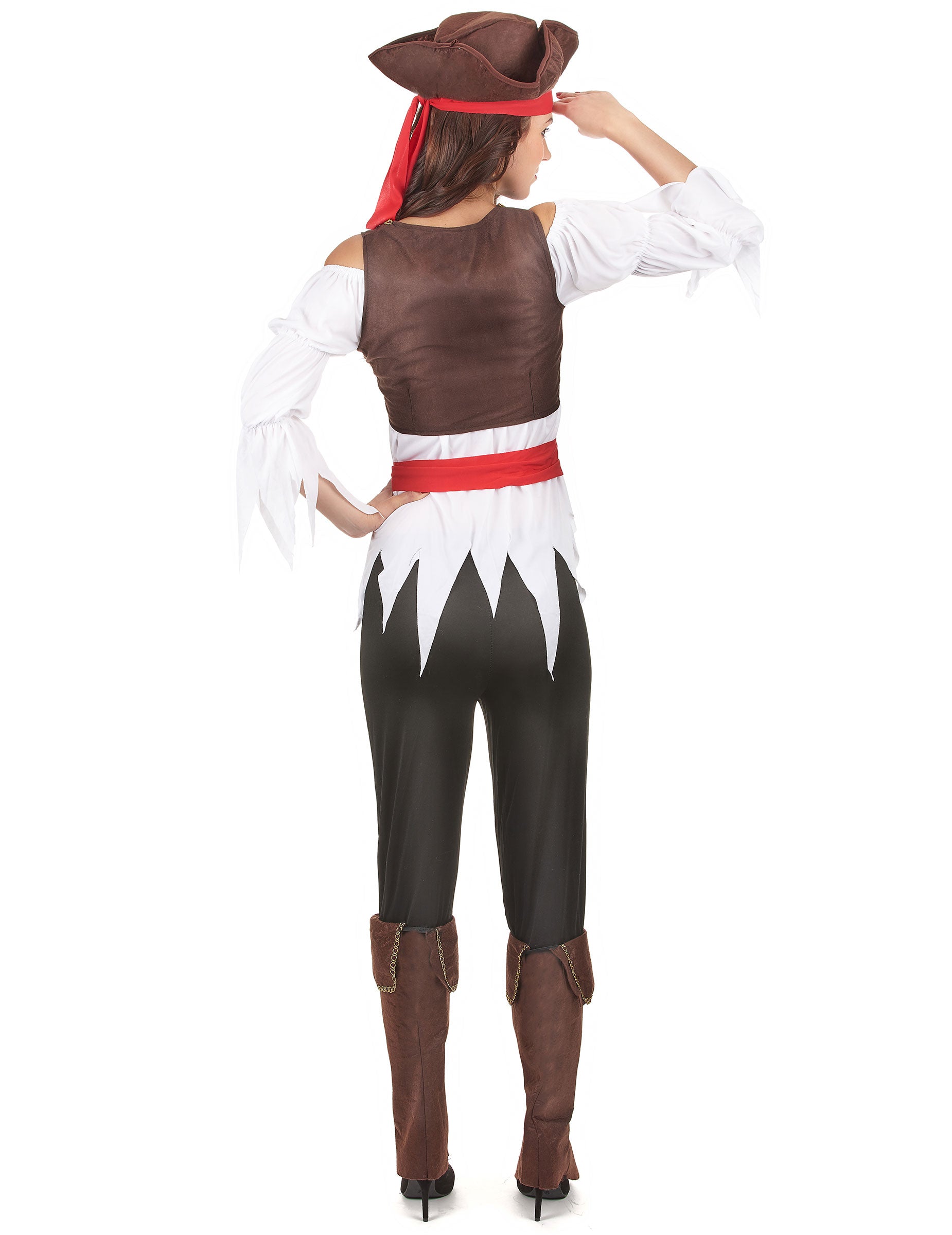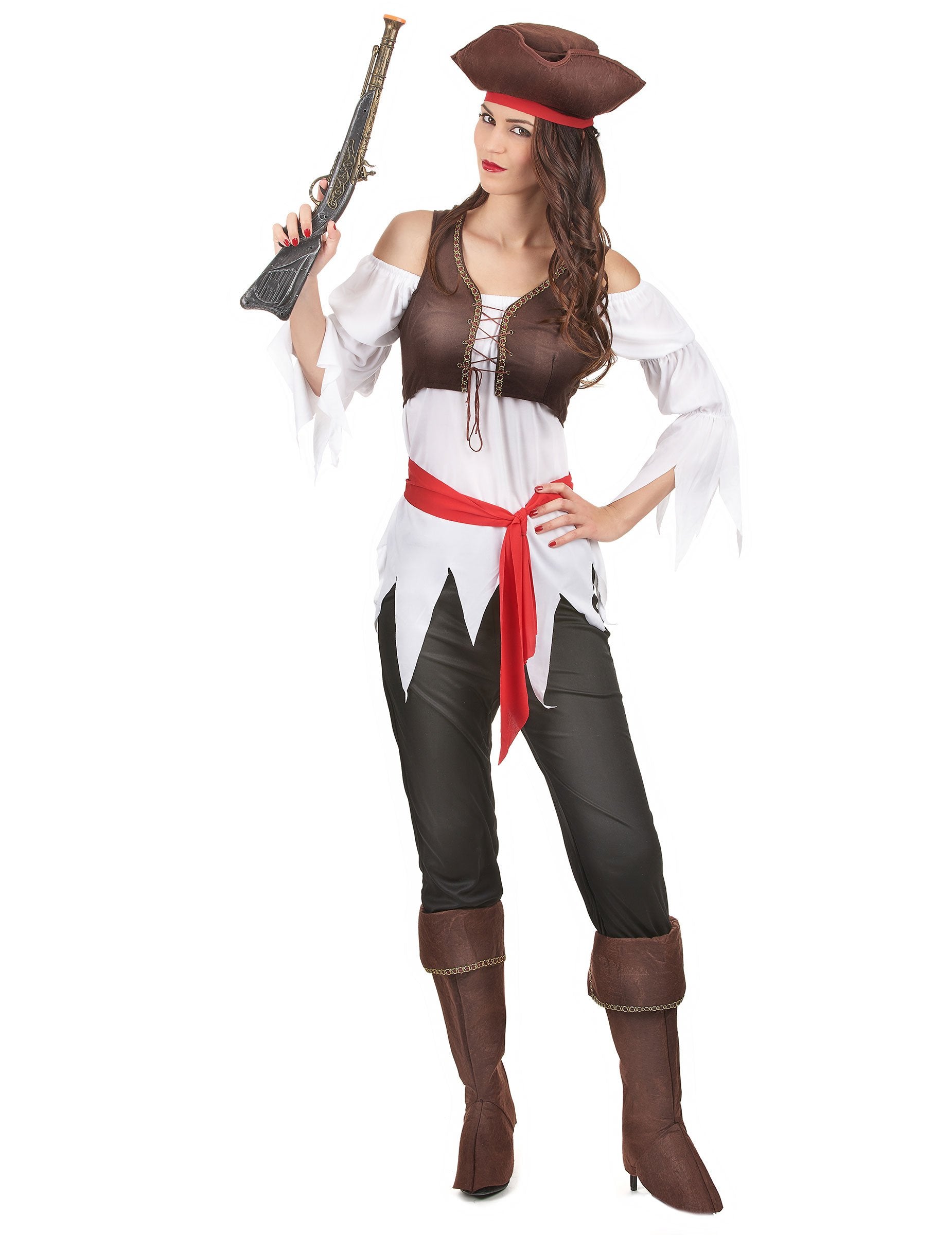 To žensko piratsko preobleko je sestavljeno iz vrha, hlač, telovne, pas, pasice, klobuka in pokrova prtljažnika (ni vključeno pištole). Vrh je bela tunika z zaključkom, razrezanim na nasvete. Telovnik je rjav z zlato pletenico, ki ustreza sur-zagonom in se zategne zahvaljujoč povezavi. Črne hlače so elastične na pasu. Pas je trak rdeče tkanine, ki se priveže okoli pasu. Trad za glavo je rdeč, ujema se s pasom. Klobuk je rjavi trikorn. Sur-zareze so rjave z zlato pletenico. Ta komplet je kot nalašč za pretvorbo v Flibustier med tematskim večerom ali za karneval.