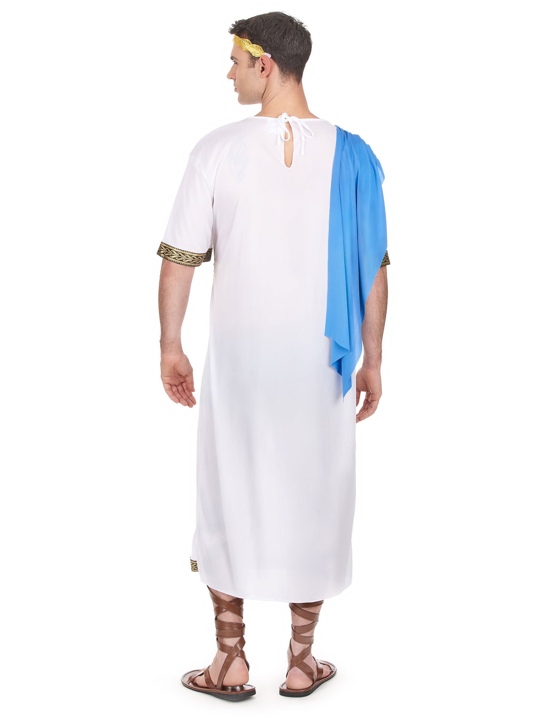 Ta grška božja preobleka za moške je sestavljena iz obleke in kape (ne vključenih čevljev). Obleka je bela s kratkimi rokavi. Dno obleke, rokavov in vratu meji na velika črna in zlata pletenica. Na sprednji strani obleke je prisotna modra zavesa in pade za desno ramo. Ta obleka se zapre v zadnji strani z dvema povezavama, ki ju je mogoče zasukati. Končno pokrivala, ki predstavlja venec zlatega lovorja, zaključi ta kostum. To je bela plastična glavna rastlinjak z lažnimi listi zlatega zaliva. Ta preobleka bo popolna, da vas bo za večer na temo mitologije postavila v čevlje grškega boga.