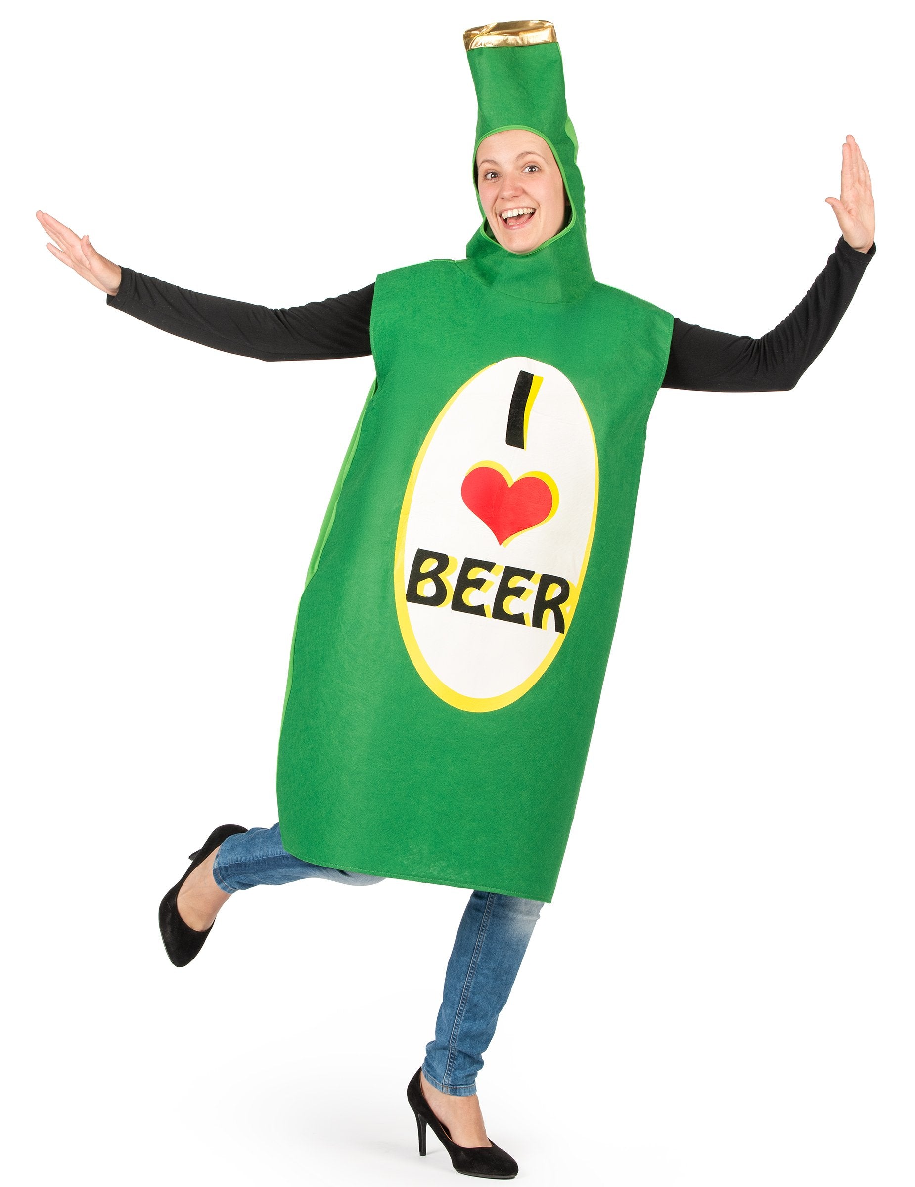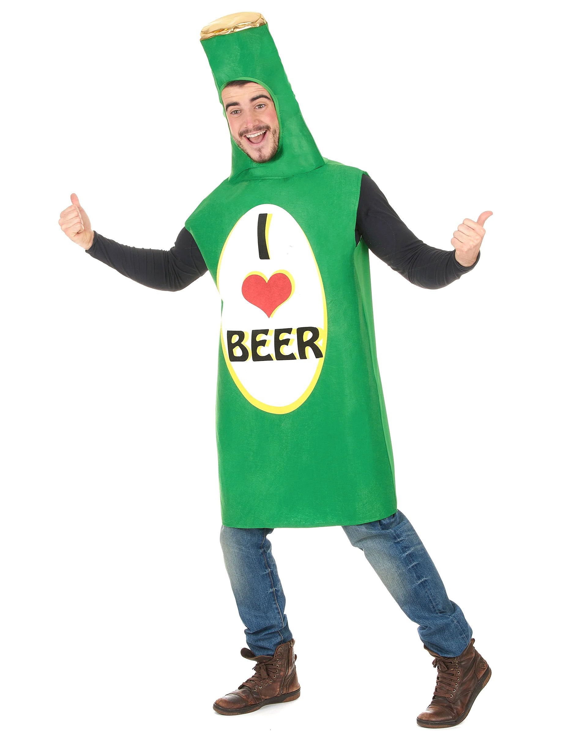 To steklenico prikrivanja za odrasle pivske steklenice je sestavljena iz kombinacije. Zelena kombinacija je v obliki pivske steklenice z zlato kapsulo. Na sprednji strani kostuma, narejenega iz debelega polčasnega filca, je prisoten napis "Ljubim pivo". Kombinacija ima na zadnji strani razširljivo tkanino, da jo lažje postavi. Okrogla odprtina vam bo omogočila, da preprosto vzamete glavo. Ta kostum bo kot nalašč za predvajanje humorne karte ob vaši bachelor zabavi ali med večerom, preoblečenim s prijatelji.