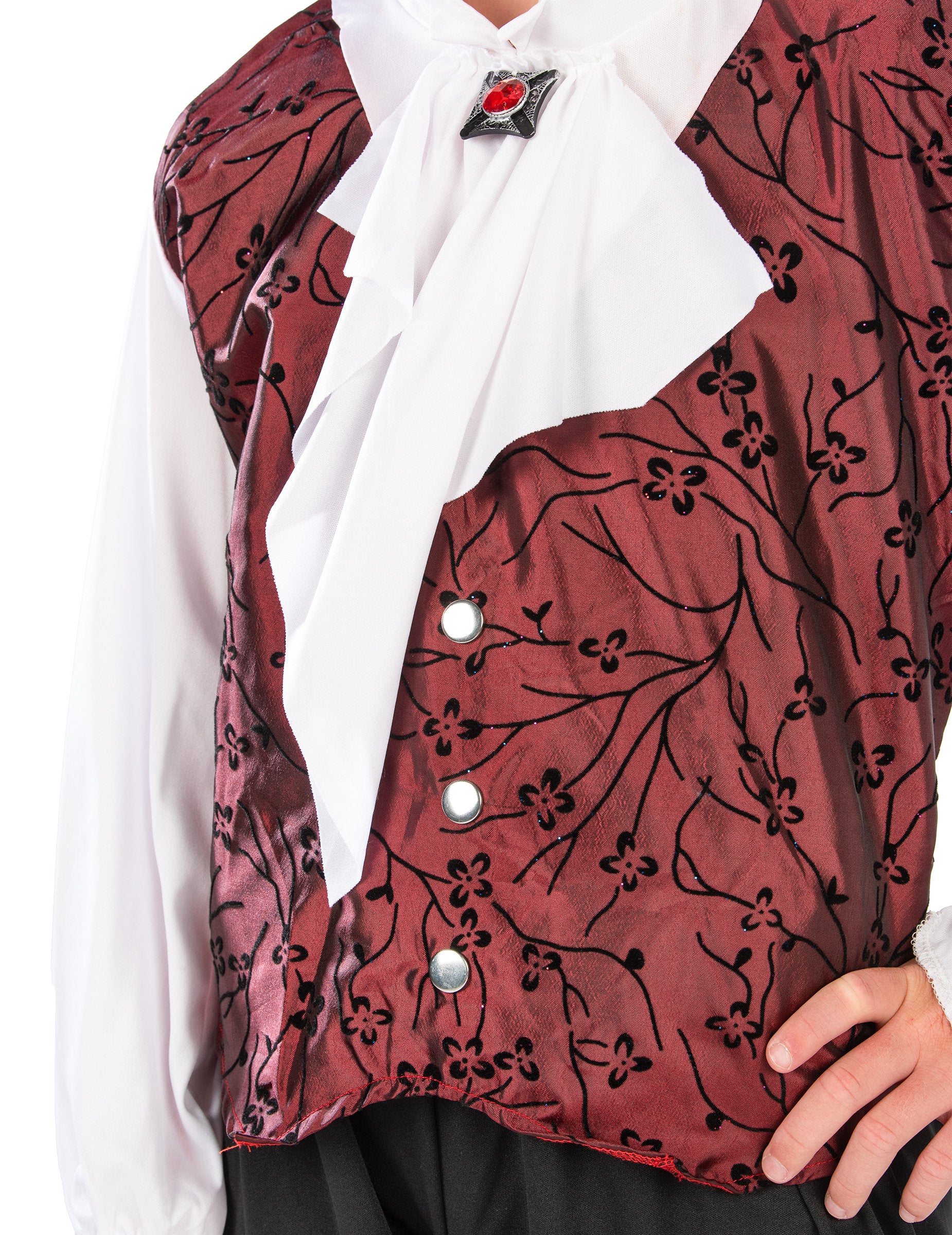 Ta vampirski kostum za fanta je sestavljen iz jopiča z rokavi, ogrinjalom in hlačami. Vrh predstavlja temno rdeč jopič z belimi rokavi. Črni črni cvetlični vzorci so prisotni na poprsju. Dno rokavov je elastično. Na materničnem vratu je dolg beli pridelek, okrašen z lažnim dragocenim rdečim kamnom. Ta vrh se zapre na vrhu hrbta z uporabo praske. Navadne hlače so črne. Elastična je na pasu. Dolg ogrinjalo zaključi ta kostum. Ocena je črna z velikim rdečim ovratnikom v notranjosti. To se zapre spredaj. Ta kostum bo kot nalašč za to, da vas spreminja v pivcu krvi na noč čarovnic ali za grozljiv večer.