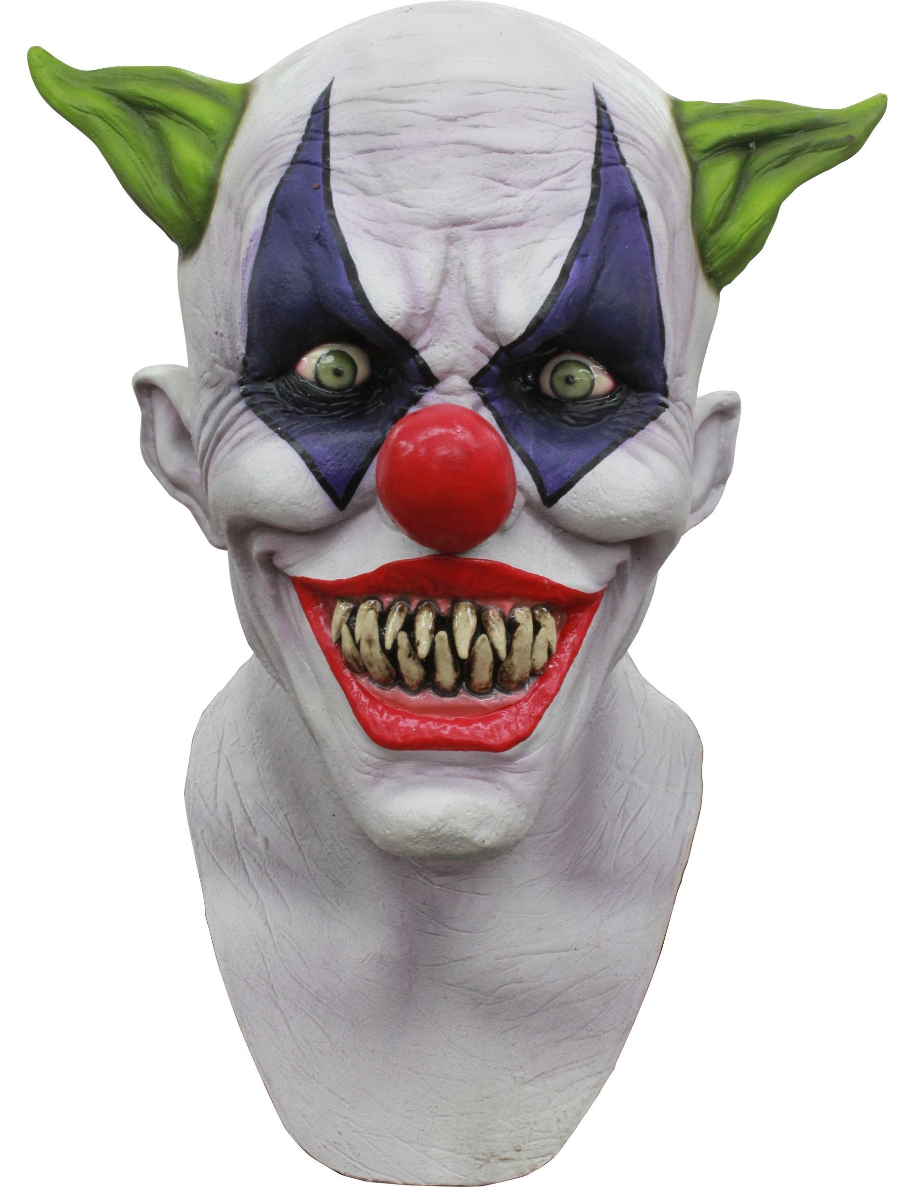 Ta polna maska ​​za odrasle je v lateksu, predstavlja strašljiv klovn. Njegov obraz je bel, lažni rdeč nos je pritrjen na konici nosu. Njen nasmeh in jasne oči so strašljive. Ta dodatna oprema je v celoti pobarvana ročno in čisti zaključki so zelo realistični. Odprtine so prisotne na očesu in ušesih. Glava glave je približno 63 cm. Ta maska ​​bo odlično prilagojena zabavi za noč čarovnic ali večer na temo groze.