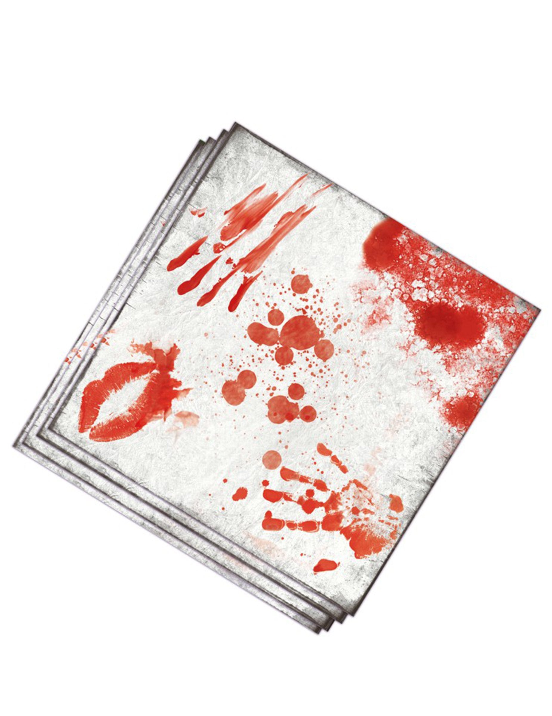 Ta paket je sestavljen iz 12 papirnatih brisač za noč čarovnic. Izmerijo približno 16,5 x 16,5 zložene in 33 x 33 cm, ko se enkrat razvije. So beli in imajo rdeč tisk, ki predstavlja sledi krvavih rok in brizganja krvi. Te brisače bodo kot nalašč za okrasitev mize med noč čarovnic.